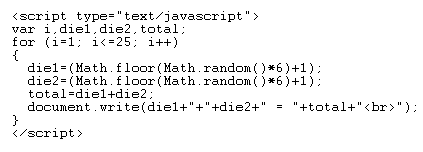 तारीफ़ के लिए शुक्रिया। वह प्रोग्राम जावास्क्रिप्ट में लिखा गया था। एक यादृच्छिक संख्या निकालना एक साधारण एक-पंक्ति कमांड है। Math.random() 0 और 1 के बीच एक यादृच्छिक दशमलव मान लौटाएगा। यहाँ 25 पासे फेंकने की संख्या उत्पन्न करने का एक सरल प्रोग्राम दिया गया है। अगर आप इस पेज को रीफ़्रेश करेंगे, तो आपको हर बार अलग-अलग परिणाम मिलेंगे।