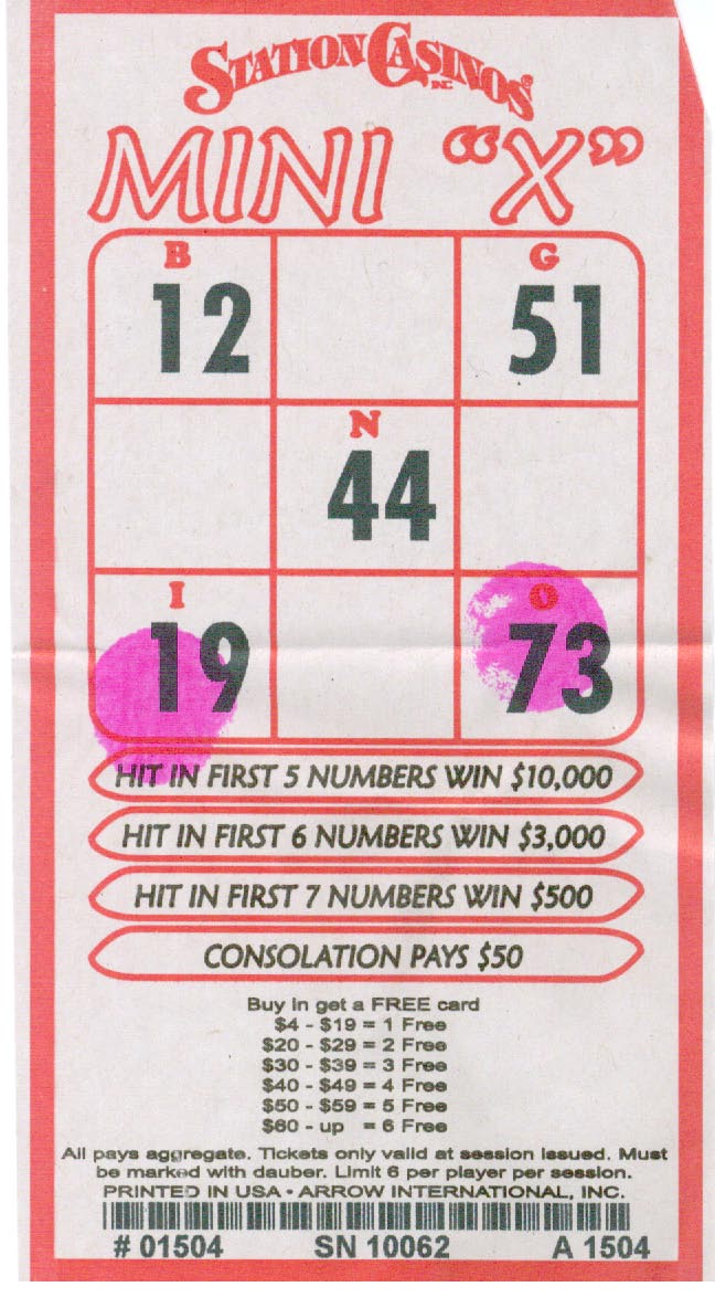 स्टेशन कैसीनो अपने बिंगो खिलाड़ियों को उनके खर्च के अनुसार, निम्नलिखित तरीके से निःशुल्क "मिनी एक्स" बिंगो कार्ड प्रदान करता है: