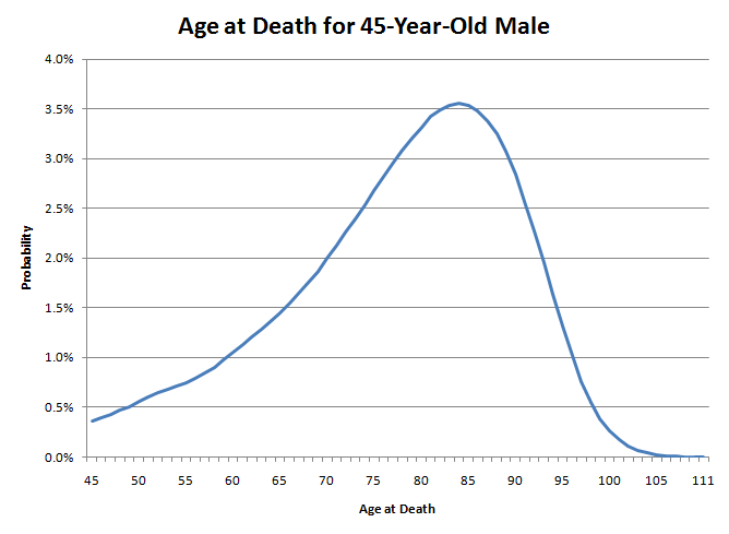 इसलिए अगर 45 साल के बहुत से पुरुष इस ग्राफ़ पर तीर चलाएँ, तो 49.96% पुरुष 45 से 79 साल के बीच तीर चलाएँगे, और 50.04% पुरुष 80 से 111 साल के बीच तीर चलाएँगे। हालाँकि, ग्राफ़ के दाईं ओर आने वाले भाग्यशाली आधे पुरुष शायद 80 साल से ज़्यादा नहीं जी पाएँगे। एक बार जब कोई पुरुष 80 साल का हो जाता है, तो वह केवल 7.78 साल और जीने की उम्मीद कर सकता है। इस बीच, बदकिस्मत आधे पुरुषों में से कई, जो 80 साल तक नहीं पहुँच पाते, उससे भी कम उम्र में मर जाएँगे। इसलिए, कम उम्र में होने वाली मौतों की संख्या ही औसत जीवन प्रत्याशा को कम करती है।