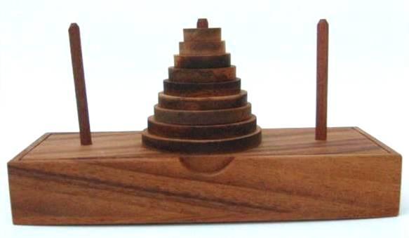 इस पहेली का नाम है हनोई का टावर। अन्य पाठकों की सुविधा के लिए, इस पहेली में तीन खूँटियाँ और मनमाने आकार के टुकड़े होते हैं, जिनमें से प्रत्येक का आकार एक जैसा लेकिन आकार अलग-अलग होता है। शुरुआत में, सभी टुकड़े क्रम से एक खूँटी पर होने चाहिए, जिसमें सबसे बड़ा टुकड़ा सबसे नीचे होना चाहिए। इसका उद्देश्य पूरे ढेर को दूसरी खूँटी पर रखना है। हालाँकि, आप किसी भी टुकड़े को छोटे टुकड़े के ऊपर नहीं रख सकते। यहाँ इस खेल का एक ऑनलाइन संस्करण दिया गया है।
