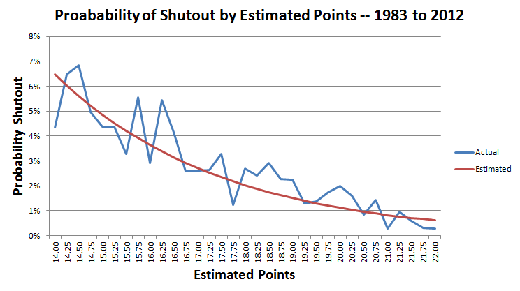 अब, आइए 1983 से 2012 के सीज़न के आधार पर, प्रत्येक टीम के अनुमानित अंकों के आधार पर शटआउट की संभावना पर नज़र डालें। मैंने उन पंक्तियों को छोड़ दिया है जहाँ नमूना आकार शून्य था।