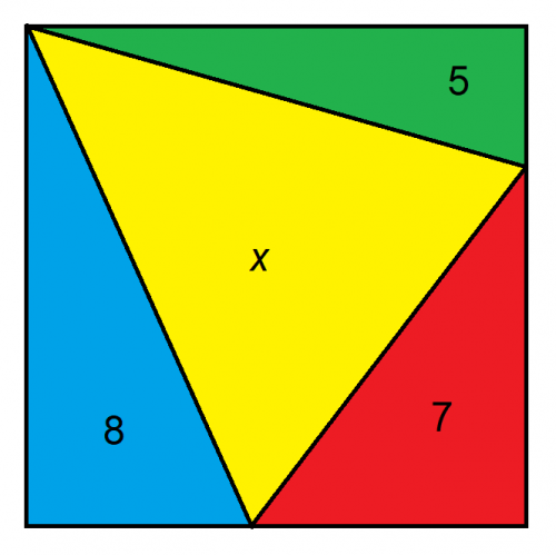 हमें दिए गए तीन त्रिभुजों का क्षेत्रफल 5+7+8=20 है। इसे वर्ग के कुल क्षेत्रफल से घटाने पर हमें x का क्षेत्रफल प्राप्त होता है: 20 + 4*sqrt(15) - 20 = 4*sqrt(15) = लगभग 15.4919।
