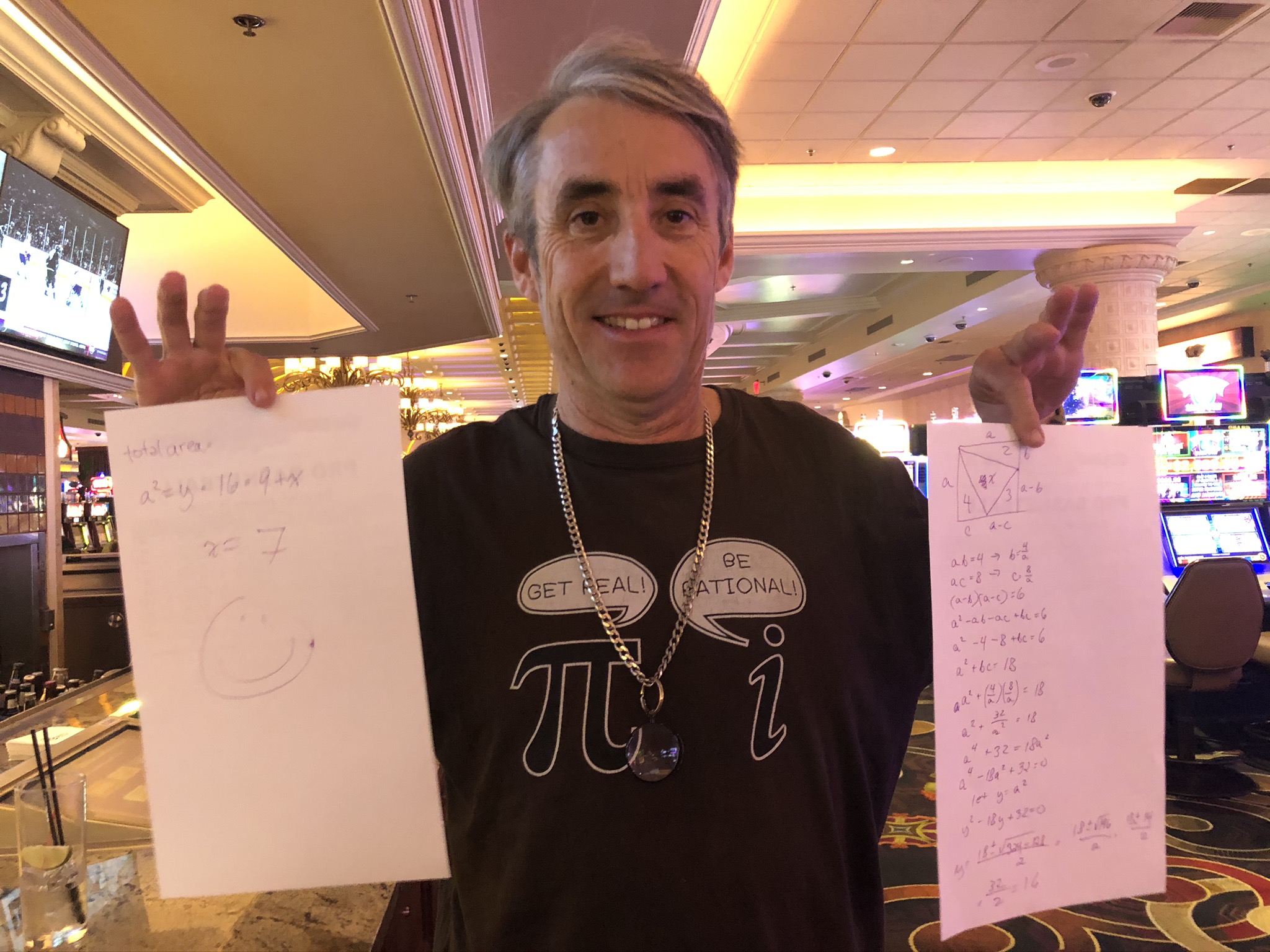 इस तस्वीर में मेरी टी-शर्ट देखिये। जब मैं "अनकट जेम्स" देखने गया था, तो सिनेमाघर के कैशियर ने इसकी तारीफ़ की थी। मैंने उसे इस समस्या से परेशान करके धन्यवाद दिया, सिर्फ़ क्षेत्रफल 2, 3 और 4 के त्रिभुजों से। फिल्म के बाद, मैंने उससे पूछा कि उसने अभी तक इसे हल नहीं किया था, लेकिन ऐसा लग रहा था कि वह कोशिश कर रही है। इसलिए मैंने सनकोस्ट बार में उसके लिए यह हल लिखा। उसे वाकई यह पसंद आया। मुझे लगता है कि वह युवती ज़िंदगी में बहुत आगे जाएगी।