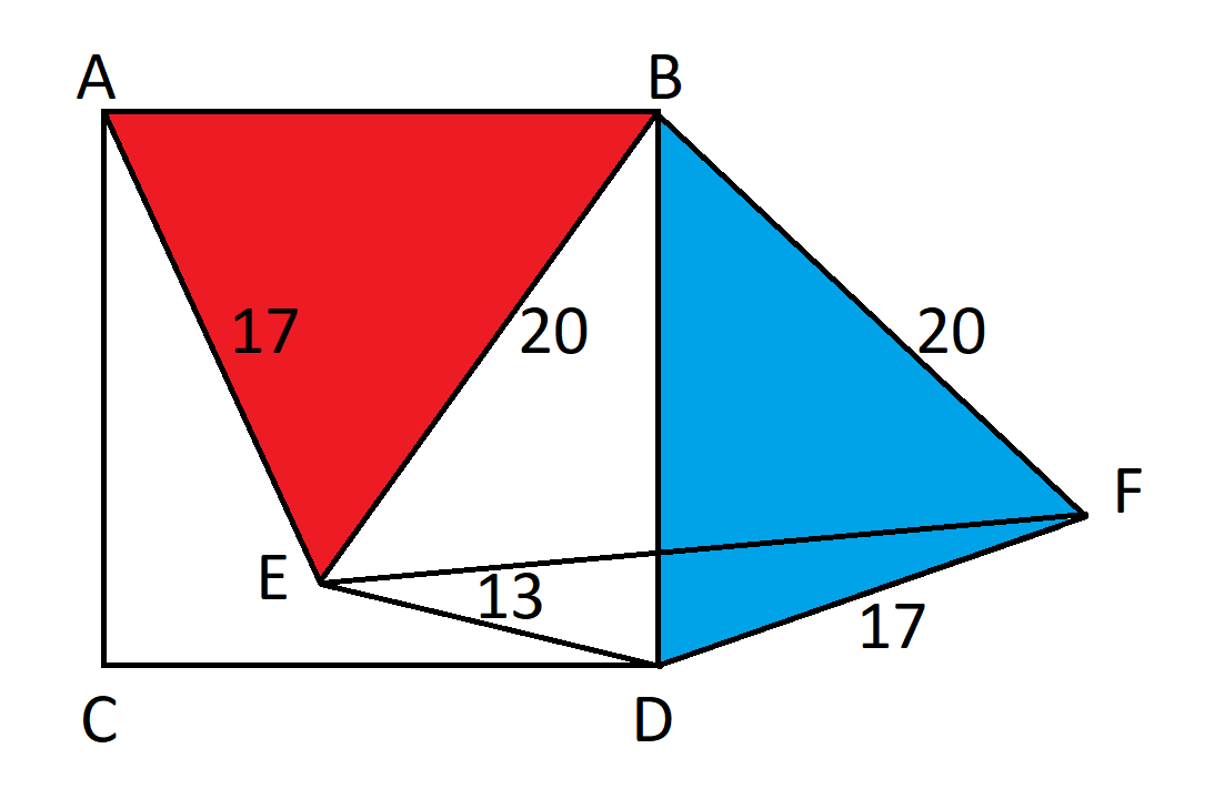 सबसे पहले, त्रिभुज ABE को 90 डिग्री घुमाकर एक नया त्रिभुज BDF बनाएं।