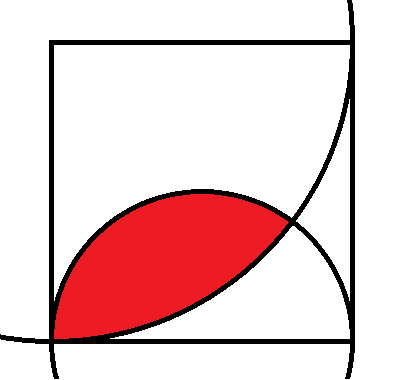 ऊपर दिए गए वर्ग की भुजा की लंबाई 2 है। एक चाप 1 त्रिज्या वाले वृत्त का है और दूसरा 2 त्रिज्या वाले वृत्त का। लाल भाग का क्षेत्रफल क्या है? आप अपने उत्तर को त्रिकोणमितीय फलनों में व्यक्त कर सकते हैं।