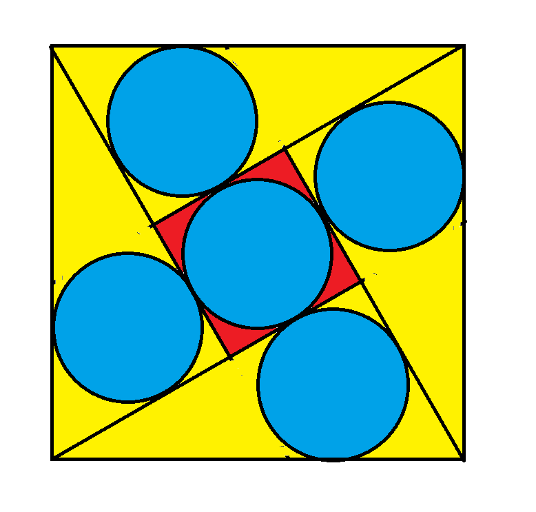 ऊपर दिए गए आरेख में चार समकोण त्रिभुज और एक बड़े वर्ग के अंदर एक छोटा वर्ग है। बड़े वर्ग की भुजा की लंबाई 1 है। सभी पाँच वृत्तों का व्यास समान है। त्रिज्या क्या है?