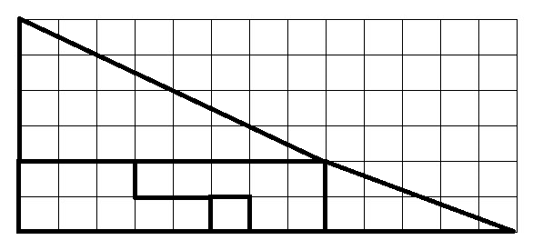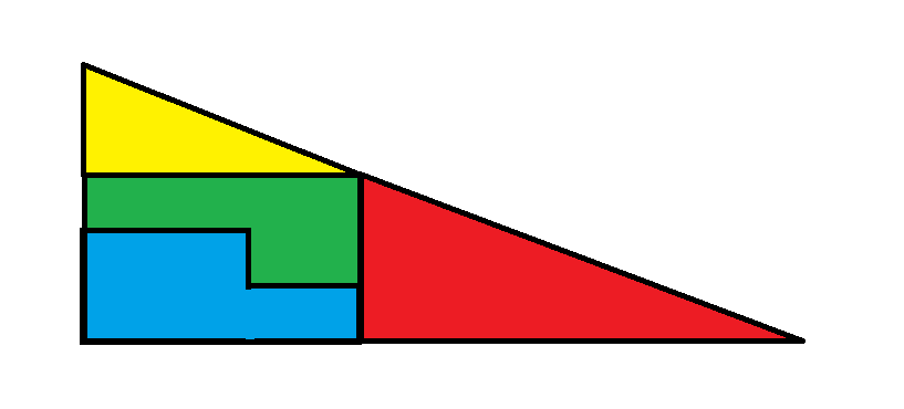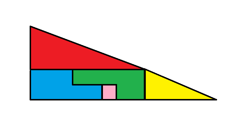 ध्यान दें कि बड़े लाल त्रिभुज की भुजाएँ क्रमशः 4 और 8 हैं। इसके बाद, छोटे पीले त्रिभुज की भुजाएँ क्रमशः 2 और 5 हैं। दूसरे शब्दों में, ये त्रिभुज समानुपाती नहीं हैं। दोनों त्रिभुजों के कर्ण का ढलान दोनों आकृतियों में दिखाए गए समान नहीं है। एक का ढलान 0.5 है और दूसरे का 0.4। टुकड़ों को दोनों आकृतियों में जिस तरह रखा गया है, उससे ऐसा लगता है कि वे 5 और 13 भुजाओं वाला एक बड़ा त्रिभुज बनाते हैं, लेकिन यह त्रिभुज नहीं है।