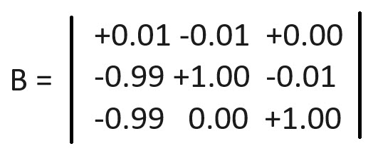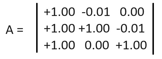 इस पर ज़्यादा कुछ पढ़ाए बिना, हल को determ(A)/determ(B) के रूप में व्यक्त किया जा सकता है। आव्यूहों में पद ऊपर दिए गए तीन समीकरणों से लिए गए हैं।