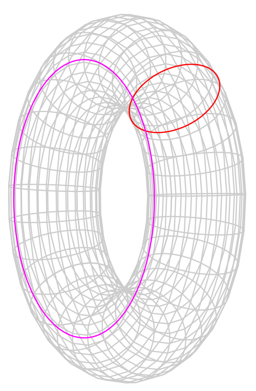 हालाँकि, वे गलत तरीके से टोरस, जिसे वे शायद डोनट कहेंगे, का पृष्ठीय क्षेत्रफल 2π 2 rR बताते हैं। वास्तविक सूत्र इसका दोगुना या 4π 2 rR है। कृपया r और R के लिए निम्नलिखित चित्र देखें।