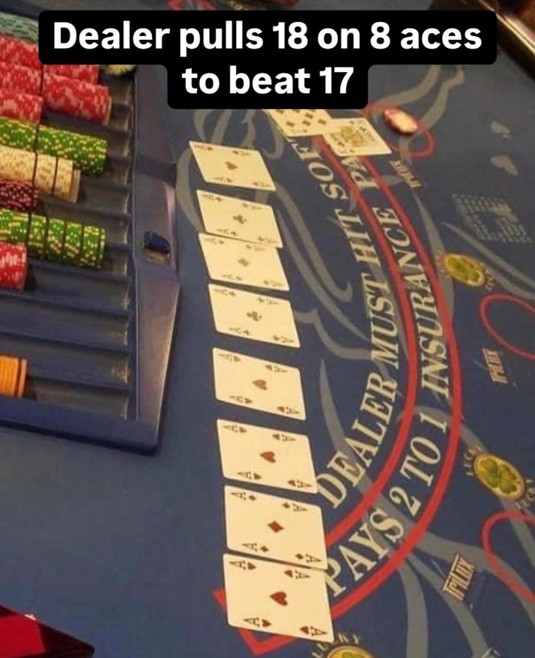 मैंने यह तस्वीर ट्विटर पर देखी। डीलर द्वारा खुद को आठ इक्के बाँटने की क्या संभावना है?