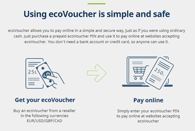 इकोवाउचर को किसी भी सामान्य भुगतान विधि के रूप में देखने पर, इसके विकल्पों की भरमार है। खिलाड़ी और संभावित उपयोगकर्ता, वैश्विक रूप से स्वीकृत ई-वॉलेट जैसे पेपाल , नेटेलर , स्क्रिल , ट्रस्टली , और साथ ही स्थानीय, समर्पित समाधानों का सहारा ले सकते हैं।