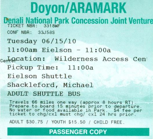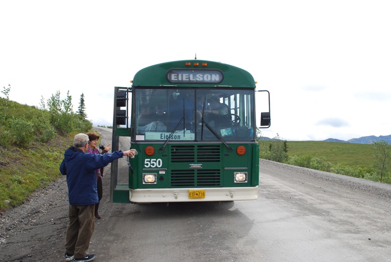 ज़ायन और ग्रैंड कैन्यन के विपरीत, जो अपेक्षाकृत सुलभ और अच्छी तरह से विकसित हैं, डेनाली तक पहुँचने के लिए 92 मील की घुमावदार कच्ची सड़क है। इसके अलावा, मुफ़्त, आरामदायक शटल में यात्रा करने के बजाय, डेनाली में हम बदसूरत पुरानी हरी स्कूल बसों में फँस गए, जिनके लिए हमें अतिरिक्त भुगतान करना पड़ा। कुछ और अच्छी दिखने वाली बसें भी थीं, लेकिन मुझे लगता है कि उनमें से किसी एक का उपयोग करने के लिए आपको किसी पैकेज्ड अलास्का टूर का हिस्सा होना चाहिए। कच्ची सड़क पर हरी बसों में से किसी एक में दिन का अच्छा हिस्सा बिताना, इस शहरी लड़के के लिए आरामदायक छुट्टी का विचार नहीं है। मैं शायद भाग्यशाली रहा कि मुझे बस मिल गई, क्योंकि बसें बहुत कम हैं, और वे ज़्यादातर समय पूरी तरह भरी रहती हैं। मुझे लगता है कि ज़्यादातर लोगों ने अपने टिकट पहले ही खरीद लिए थे। सड़क से 66 मील दूर, और फेयरबैंक्स के बाहर वायु सेना बेस से भ्रमित न हों, एइलसन विज़िटर सेंटर तक मेरे आने-जाने के वयस्क टिकट की कीमत $30.75 थी।