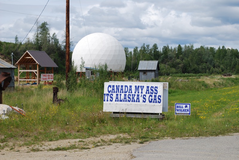 मेरी राय में, अलास्का पाइपलाइन अमेरिका की सबसे बड़ी इंजीनियरिंग सफलता की कहानियों में से एक है, इसलिए मुझे इसे पहली बार देखकर गर्व हुआ। हाईवे के उस पार एक बड़ा सा बोर्ड लगा था जिस पर लिखा था, "कनाडा मेरी गांड, यह अलास्का की गैस है," यह भावना मैंने अपनी यात्रा के दौरान कई बार पढ़ी। यह प्राकृतिक गैस के लिए दूसरी पाइपलाइन बनाने के दोहरे प्रस्तावों का संकेत था, एक छोटी पाइपलाइन जो कनाडा की पाइपलाइन से जुड़ेगी या एक लंबी पाइपलाइन जो मौजूदा तेल पाइपलाइन के रास्ते पर ही बनेगी।
