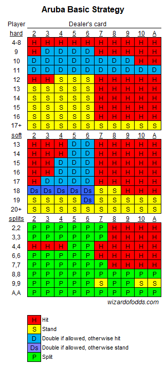 कुछ अपवादों को छोड़कर, सभी ब्लैकजैक नियम छह डेक वाले लगते हैं, ब्लैकजैक में 3-2 का भुगतान होता है, डीलर सॉफ्ट 17 पर हिट करता है, किन्हीं दो पत्तों को दोगुना कर सकता है, विभाजित होने के बाद दोगुना कर सकता है, आत्मसमर्पण की अनुमति नहीं है और इक्कों को दोबारा विभाजित करने की अनुमति नहीं है। सावधान रहें कि दुर्भाग्य से 6-5 ब्लैकजैक ने अरूबा पर आक्रमण कर दिया है। मैंने RIU के ऑर्किड कैसीनो में भी एक डबल-डेक गेम देखा। मेरा अनुमान है कि 60% टेबलों पर स्वचालित शफलर, 30% पर हैंड शफल और 10% पर निरंतर शफलर का उपयोग किया गया था। पहले दो प्रकारों पर प्रवेश लगभग 2/3 था। अरूबा नियमों के तहत मूल रणनीति निम्नलिखित है: