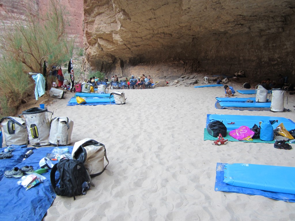 OARS ने प्रति अतिथि 50 डॉलर में एक स्लीपिंग किट उपलब्ध कराई। मैंने देखा कि हर दूसरा अतिथि इसी विकल्प का इस्तेमाल कर रहा था। मैंने खुद एडन और अपने लिए स्लीपिंग किट लाने की योजना बनाई थी, लेकिन यात्रा से कुछ दिन पहले, OARS के किसी व्यक्ति ने बताया कि हमारे आखिरी दिन सामान ढोने वाले खच्चर ओवरबुक हो गए हैं और पूछा कि क्या मुझे कोई आपत्ति होगी अगर मेरा अतिरिक्त सामान अगले दिन ढोकर मेरे पास भेज दिया जाए। बदले में, वे हमें दो स्लीपिंग किट मुफ्त में इस्तेमाल करने देंगे। चूँकि यात्रा के बाद मुझे वैसे भी कुछ समय के लिए अपने सामान की ज़रूरत नहीं पड़ेगी, इसलिए मैंने हाँ कर दी।स्लीपिंग किट में एक स्लीपिंग बैग, चादर और तकिया शामिल था। उन्होंने हमें एक फुलाया हुआ स्लीपिंग पैड भी दिया, जो पहले से ही फुलाया हुआ था। रात में इतनी गर्मी होती थी कि मैं पहले स्लीपिंग बैग के ऊपर और चादर के नीचे ही सोता था। लेकिन, रात के लगभग 2 बजे मुझे ठंड लगने लगती और मैं बैग में दुबक जाता।