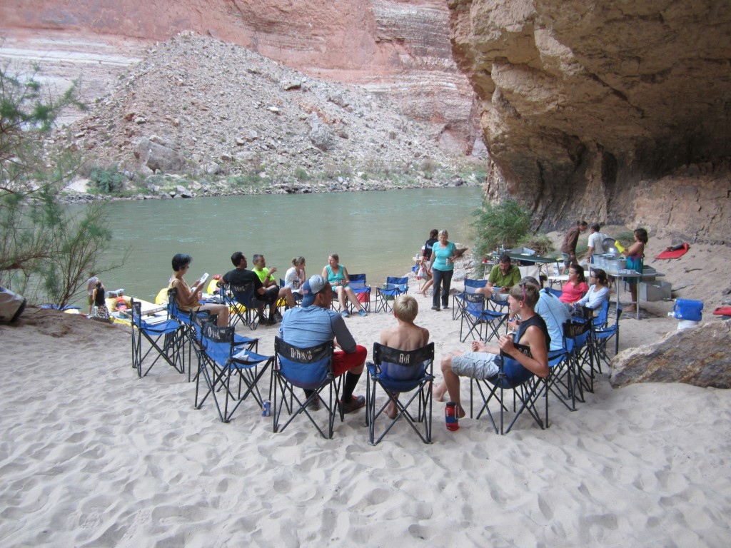हमारी ट्रिप लीडर, एंड्रिया ने क्या लाना है, इस बारे में सवालों पर चर्चा की और कुछ निजी सुझाव दिए जो OARS सूची के सुझावों के विपरीत थे, जिसके तहत कुछ मेहमानों को आखिरी समय में खरीदारी के लिए जाना पड़ा था। पीछे मुड़कर देखने पर, मुझे लगता है कि उनके कुछ सुझाव ज़रूरत से ज़्यादा सुरक्षात्मक थे, लेकिन इस यात्रा पर हर किसी को मेरे जैसा बैकपैकिंग अनुभव नहीं होता, जहाँ व्यक्ति बहुत कम में काम चलाना सीख जाता है और जो कुछ भी उसके पास है, उसी में ढल जाता है।