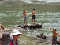 पहले दिन हमें जो कुछ तेज़ धाराएँ मिलीं, वे हल्की थीं। तेज़ धाराओं से परिचित होने के कारण, धीरे-धीरे मेरे और मेरे बेटे जैसे नए लोगों को सहजता महसूस होने लगी। शांत पानी के कई लंबे हिस्सों को कम करने के लिए, कर्मचारियों ने पानी की लड़ाइयों में इस्तेमाल के लिए बड़ी सीरिंजें मँगवाईं। ठंडक पाने के लिए राफ्ट से बाहर कूदने को भी प्रोत्साहित किया गया।
