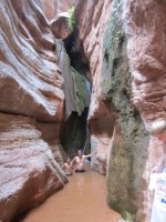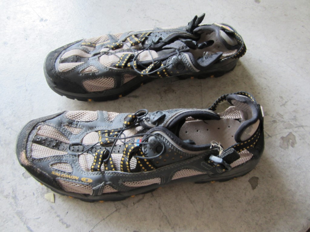 - पानी के जूते । ये जूते पानी में चलने के लिए हैं, जैसे ज़ायन के नैरोज़। ये आम जूतों की तरह ही होते हैं, लेकिन जालीदार कपड़े से बने होते हैं जो जल्दी सूख जाते हैं। एक अच्छी जोड़ी सैंडल (फ्लिप-फ्लॉप नहीं) ही काफी होते, लेकिन हमने काफ़ी लंबी पैदल यात्रा की, और उसके लिए ये जूते ज़्यादा आरामदायक हैं और उतने फिसलन भरे नहीं हैं।