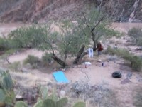 फिर कुछ गाइड नदी के नीचे फैंटम रैंच गए और वापस आकर बैग पहुँचा दिए। इस दौरान, हममें से बाकी लोगों ने पानी के किनारे एक छायादार जगह ढूँढ़ी और आराम से बीयर और स्कॉच की एक बोतल पी, जिसे एक गाइड ने हमें भी बाँटने की अनुमति दे दी।