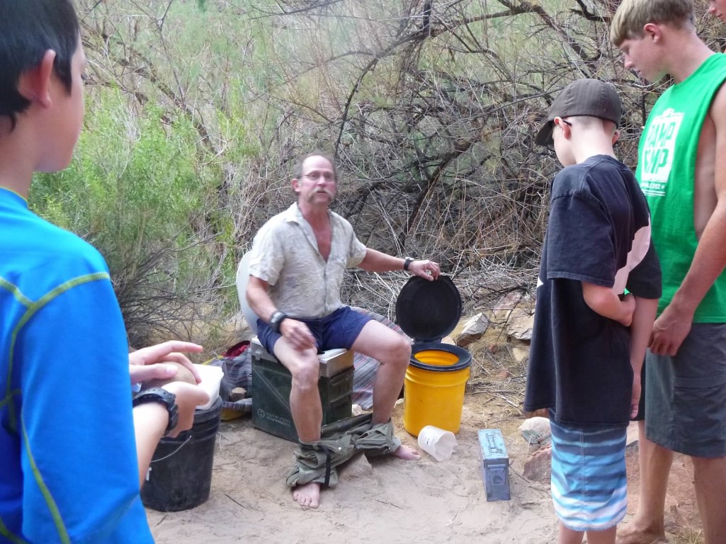 पेशाब करने के लिए, हमें सीधे नदी में जाने के लिए प्रोत्साहित किया जाता था, क्योंकि वे वैसे भी पेशाब की बाल्टी नदी में ही डाल देते थे। जैसा कि वे कहते हैं, "प्रदूषण का समाधान पतलापन है।" शुरू-शुरू में, मेरे समेत पूरा समूह इतने सारे विपरीत लिंग के लोगों के बीच पेशाब करने के शिष्टाचार को लेकर अनिश्चित लग रहा था। हालाँकि, ऐसा करने के लिए एक अलग जगह ढूँढ़ना आमतौर पर मुश्किल होता था, क्योंकि समुद्र तट अक्सर छोटे होते थे और/या घनी वनस्पतियों या चट्टानों से घिरे होते थे।