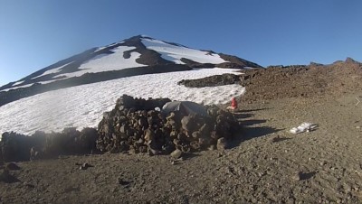 हम दोनों के लिए यह पहली चढ़ाई थी और पूरे दिन हमने किसी को भी अपनी दिशा में चढ़ते नहीं देखा। मुझे पता था कि हम लंच बॉक्स काउंटर नाम की जगह पर डेरा डालना चाहते हैं, लेकिन मुझे ठीक से पता नहीं था कि वह कहाँ है। जब रास्ता पेड़ों की रेखा से अलग होता था, तो वह कमोबेश ज्वालामुखीय चट्टानों का ढेर बन जाता था। जहाँ भी समतल जगह मिलती, लोगों ने तंबुओं के लिए हवा से बचाव के लिए टेंट बनाए होते थे। मुझे लगता है कि नीचे वाले तंबू उन लोगों के लिए थे जो तीन दिनों में चढ़ाई करने की योजना बना रहे थे। इनमें से कुछ कैंपिंग क्षेत्रों को लंच बॉक्स काउंटर समझने की भूल आसान हो सकती है। हालाँकि, ऐसा नहीं है। लगभग एक दर्जन कैंपिंग स्थलों वाले समतल क्षेत्र के बाद एक लंबा, मध्यम ढलान वाला बर्फ का मैदान है। लंच बॉक्स काउंटर तक पहुँचने के लिए इस मैदान पर चढ़ने में कम से कम एक घंटा लगता है, जो बर्फ के मैदान के बीच में चट्टानी द्वीपों पर एक बड़े क्षेत्र में फैला हुआ है। हमने जहाँ डेरा डाला वह लंच बॉक्स क्षेत्र के निचले सिरे पर था और हमारे पास एक बड़ा चट्टानी द्वीप था, जिसमें कई कैंपिंग स्थल थे, और वह भी पूरी तरह से हमारे लिए।