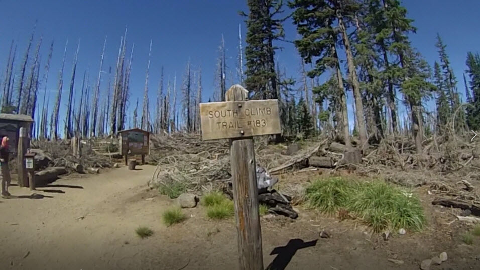 पगडंडी एक जले हुए जंगल से शुरू होती है और कुछ मील तक ऐसे ही रहती है। हालाँकि पैदल यात्रा का यह हिस्सा थोड़ा उबाऊ था, फिर भी जैसे-जैसे हम ऊँचाई पर पहुँचे, हमें माउंट हूड और बाद में माउंट सेंट हेलेन्स के शानदार नज़ारे देखने को मिले। आखिरकार, हम उस जगह से बाहर निकले जहाँ पहले जंगल की आग लगी थी और जहाँ हमने जीवित पेड़ और ल्यूपिन के खेत देखे (जिन्हें मैंने चढ़ाई के अपने वीडियो में ग़लती से लैवेंडर कहा है)।
