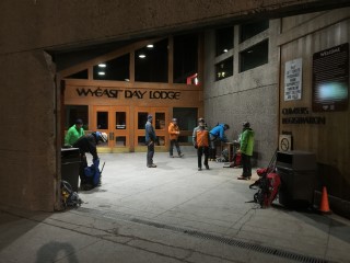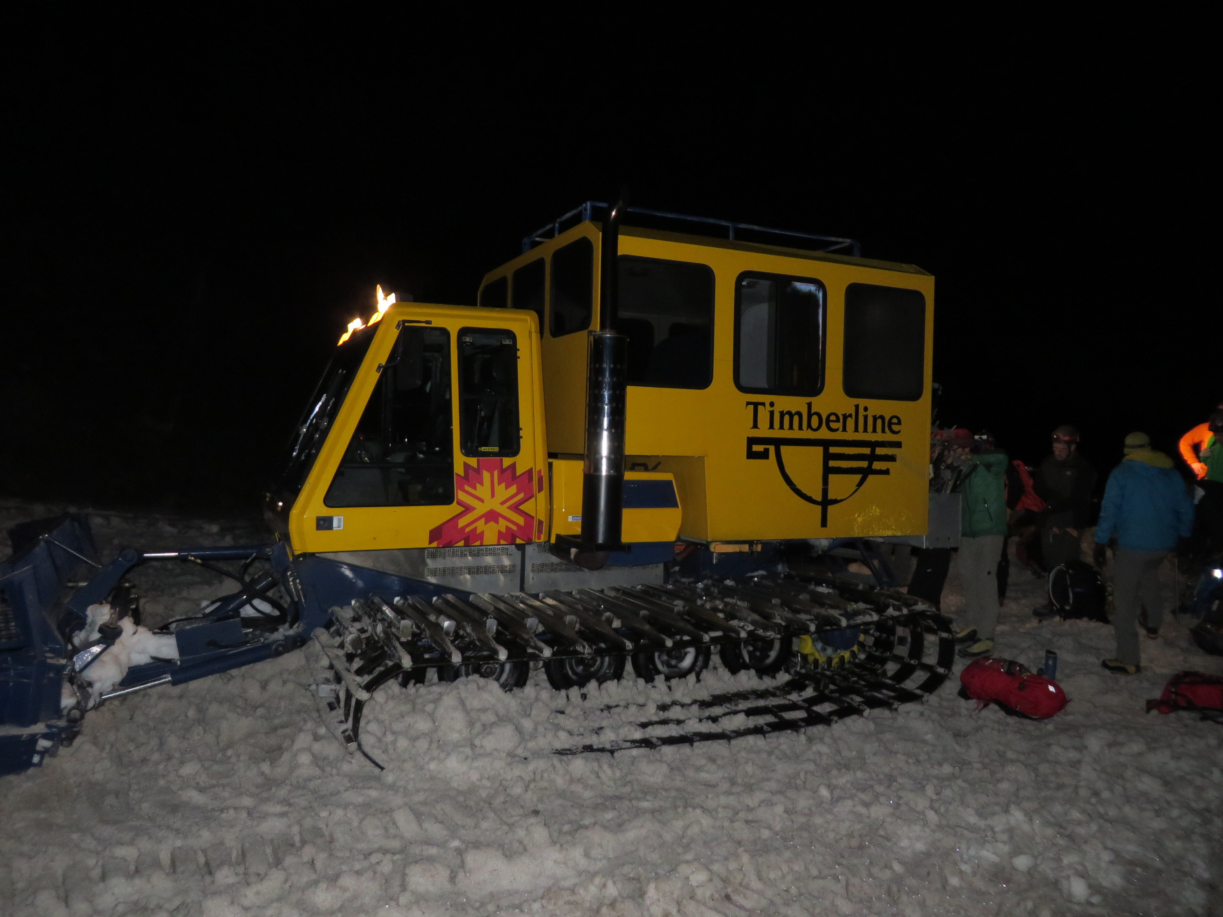 अपने बैग में तरह-तरह के कपड़े और सामान भरकर, जिनमें से ज़्यादातर को मैं छूना नहीं चाहता था, मैं तय समय से काफ़ी पहले ही मिलन स्थल पर पहुँच गया। लगभग 2:00 बजे, हम पहाड़ पर उस जगह के पास बर्फ़ से भरी एक खाई की ओर चल पड़े जहाँ हमने एक दिन पहले प्रशिक्षण लिया था। फिर हम स्की क्षेत्र में ऊपर जाने के लिए एक स्नो कैट में सवार हुए। यह मुझे थोड़ा-बहुत धोखाधड़ी जैसा लगा, लेकिन समय और ऊर्जा की बचत ने सभी के शिखर पर पहुँचने की संभावनाओं को बढ़ा दिया। साथ ही, मैं अपने 2011 के प्रयास में ड्रॉप-ऑफ़ बिंदु से ज़्यादा ऊँचाई पर गया था, इसलिए इससे मुझे इसे सही ठहराने में मदद मिली। जो लोग इसे धोखाधड़ी मान सकते हैं, उनके लिए TMG दो दिन की रात भर की यात्रा भी प्रदान करता है जिसमें लॉज से पूरी चढ़ाई शामिल है। ऐसा एक समूह हमारे प्रशिक्षण से ठीक पहले रवाना हुआ था, और वे ख़ास तौर पर हमारे समूह की तुलना में, युवाओं का एक मज़बूत और छोटा समूह लग रहा था।