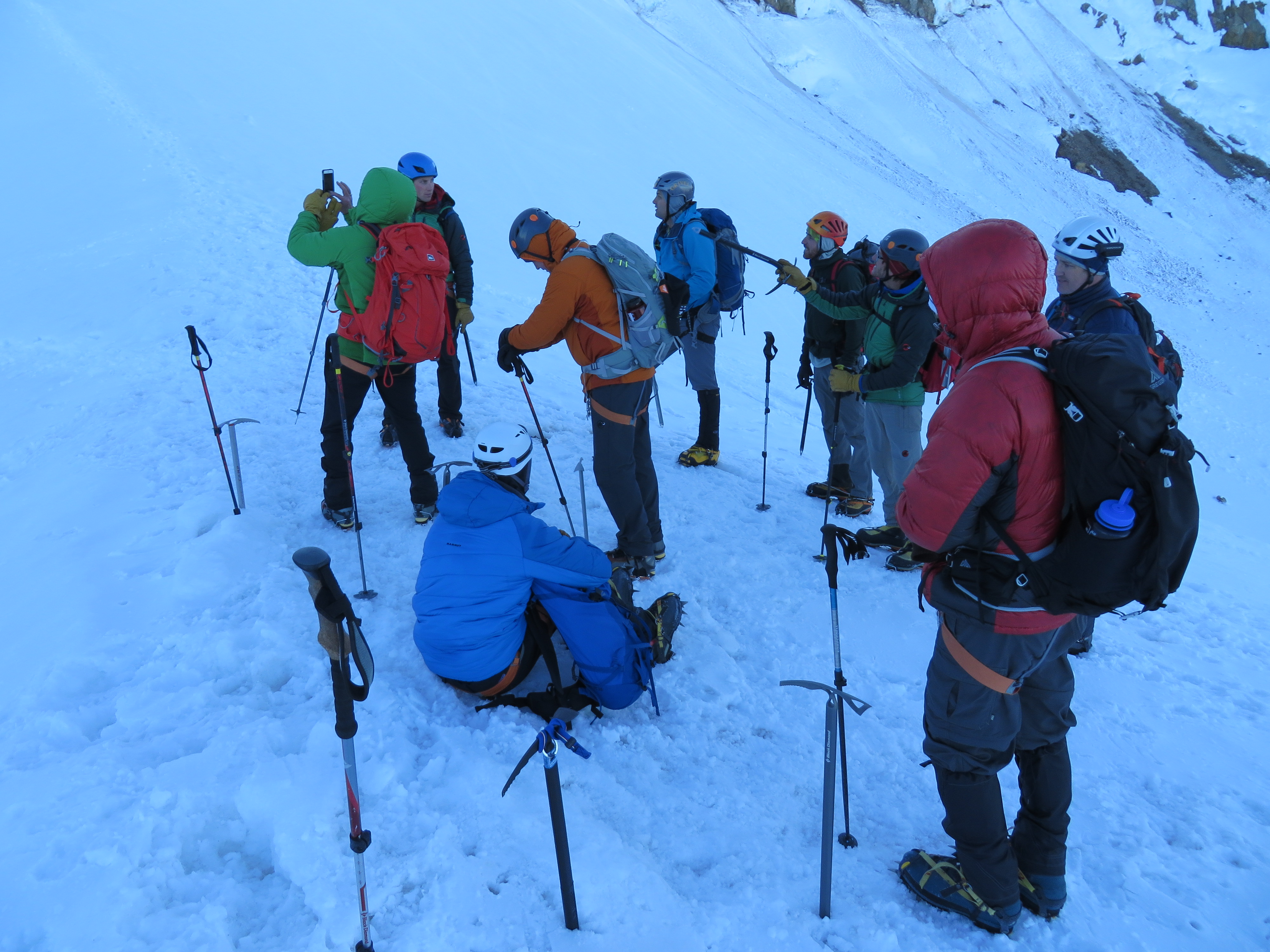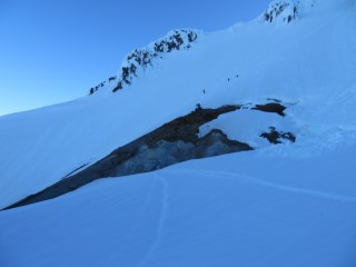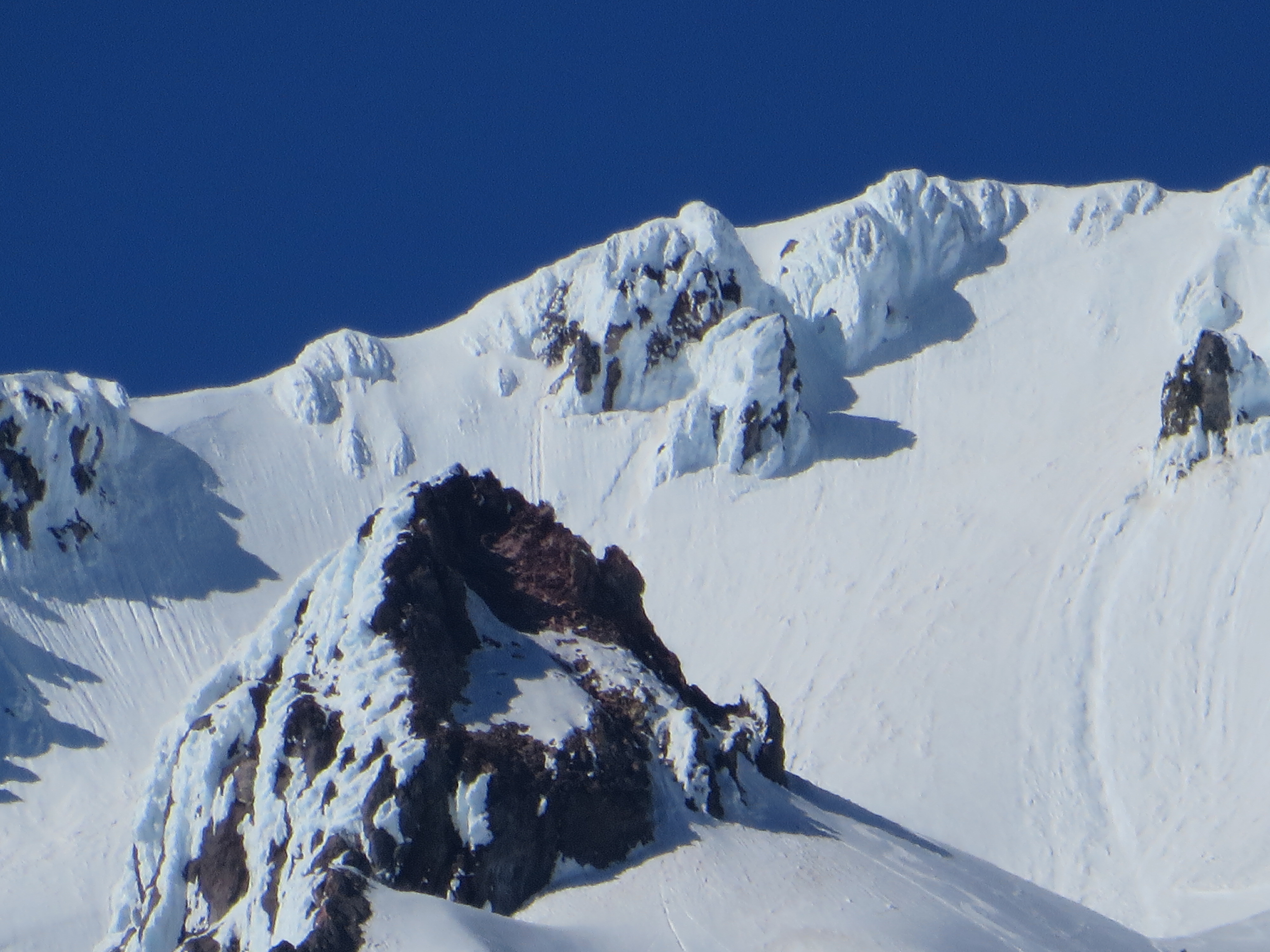 अगली ढलान से सचमुच बहुत सारी बर्फ गिर रही थी। इस बार, टुकड़े गोल्फ की गेंद जितने बड़े थे और मैंने जो भी कपड़े पहने थे, उसके बावजूद कुछ टुकड़े मुझे लगे तो थोड़ा दर्द हुआ। एक और बात यह थी कि मेरे स्की गॉगल्स, जो मेरे बैग में बिल्कुल भूल गए थे, कम से कम मुझे सुरक्षित महसूस कराते। चढ़ाई के सभी बिंदुओं में से, ढलान के नीचे बैठना शायद सबसे खतरनाक था।जैसा कि मैंने बताया, 1:30 बजे निकलने का कारण ओल्ड च्यूट को समाप्त करना था, इससे पहले कि यह बहुत गर्म हो जाए और बर्फ अस्थिर हो जाए और टुकड़ों में टूट जाए।