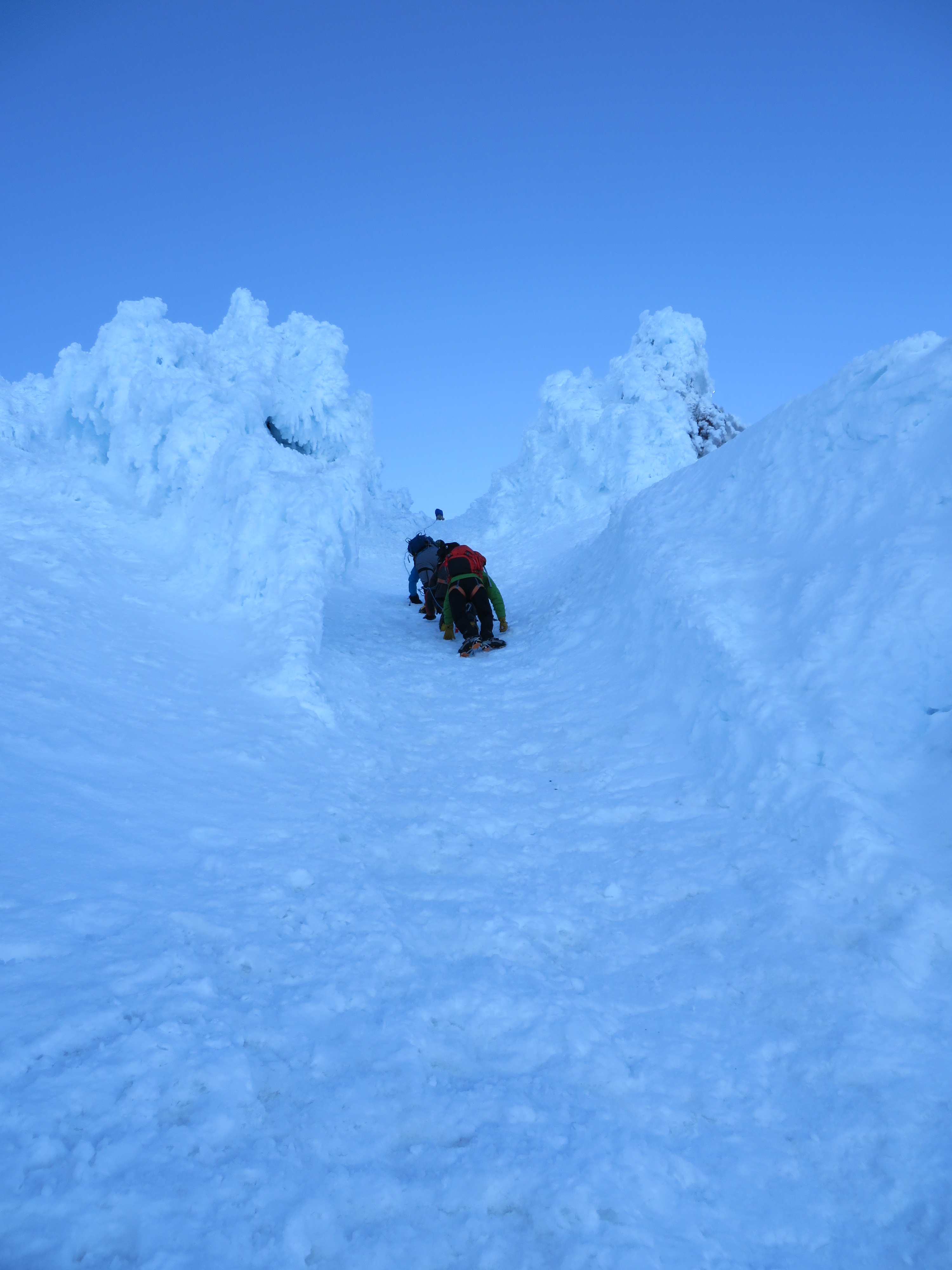अपना सामान व्यवस्थित करने के बाद, हम लगभग आधे घंटे तक माउंट हूड की ओर एक खड्ड तक पैदल चले, जहाँ खड़ी बर्फ थी। वहाँ हमें क्रैम्पन (बर्फ पर चढ़ने के लिए जूतों में लगाए जाने वाले कीलें), बर्फ की कुल्हाड़ियाँ, बेलेइंग और छोटी रस्सी से चढ़ाई करनी थी। इनमें से बहुत कुछ मैं पिछली पर्वतीय चढ़ाई से पहले से ही जानता था। हो सकता है कि यह मेरे लिए नुकसानदेह रहा हो, क्योंकि मैं अपने ही सीखे हुए तरीकों पर कुछ हद तक अड़ा हुआ था, जिसके बारे में गाइड मुझे बार-बार समझाते रहते थे।