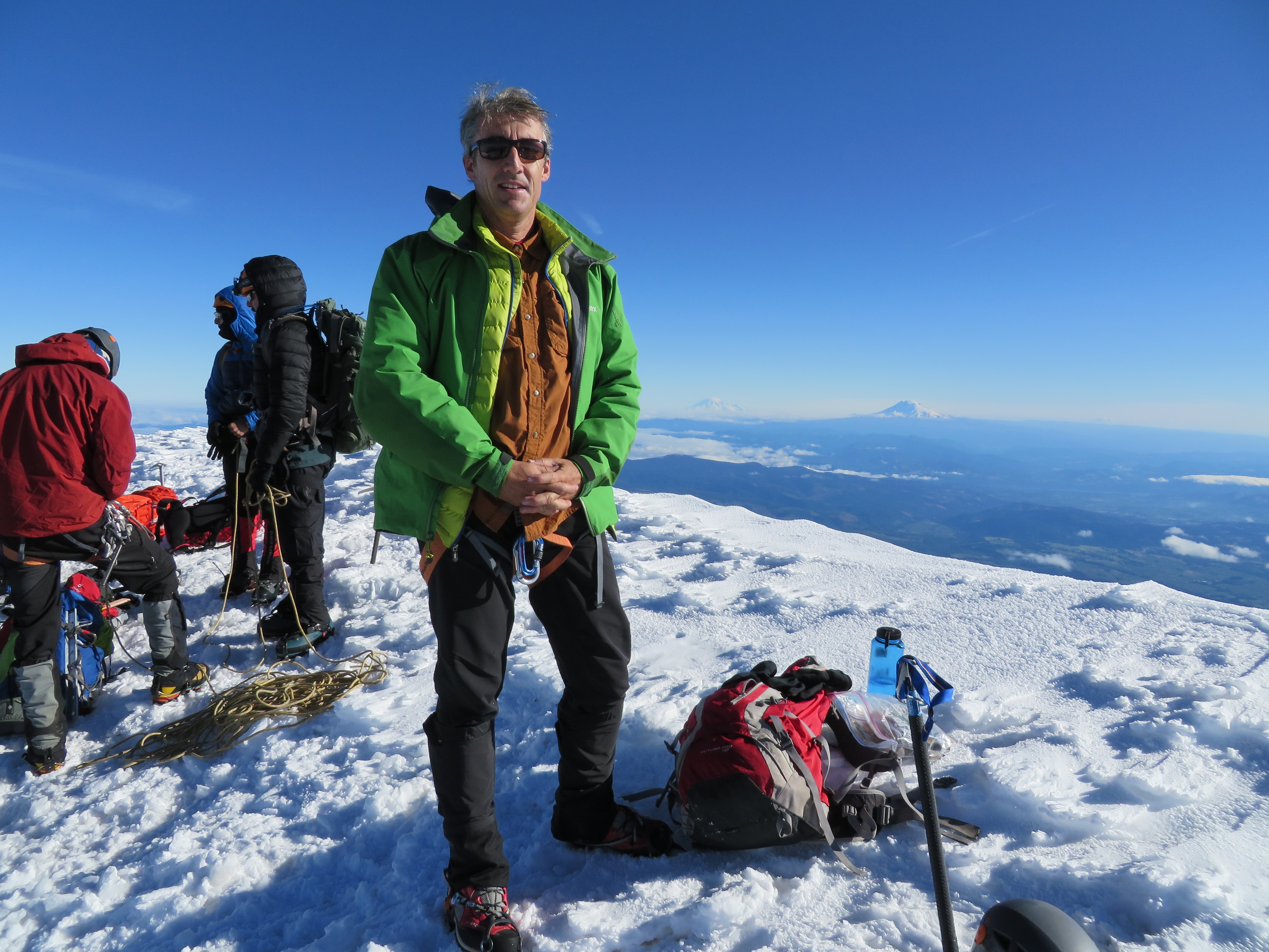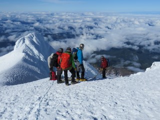 कुछ ही मिनटों बाद, हम शिखर पर पहुँच गए! हमारे दल के अलावा, वहाँ और भी समूह थे। मुझे पता था कि गाइड हमें जल्दी में ले जा रहे हैं, इसलिए मुझे इस पल का आनंद लेने का समय नहीं मिला। मैंने पानी पिया और फिर शिखर की ज़रूरी तस्वीरें लेने के लिए अपना कैमरा निकाला। नज़ारे अद्भुत थे। हम बादलों के ऊपर से जेफरसन, एडम्स, रेनियर और सेंट हेलेन्स पर्वतों को आसानी से देख सकते थे। दूर से तीन बहनें भी दिखाई दे रही थीं। हालाँकि, नज़ारों का आनंद लेने या उपलब्धि पर विचार करने के लिए ज़्यादा समय नहीं था। गाइड वापस लौटने के लिए उत्सुक थे, क्योंकि हम तय समय से बहुत पीछे थे। चोटी पर 15-20 मिनट बिताने के बाद, मैं वापस नीचे जाने वाला था।