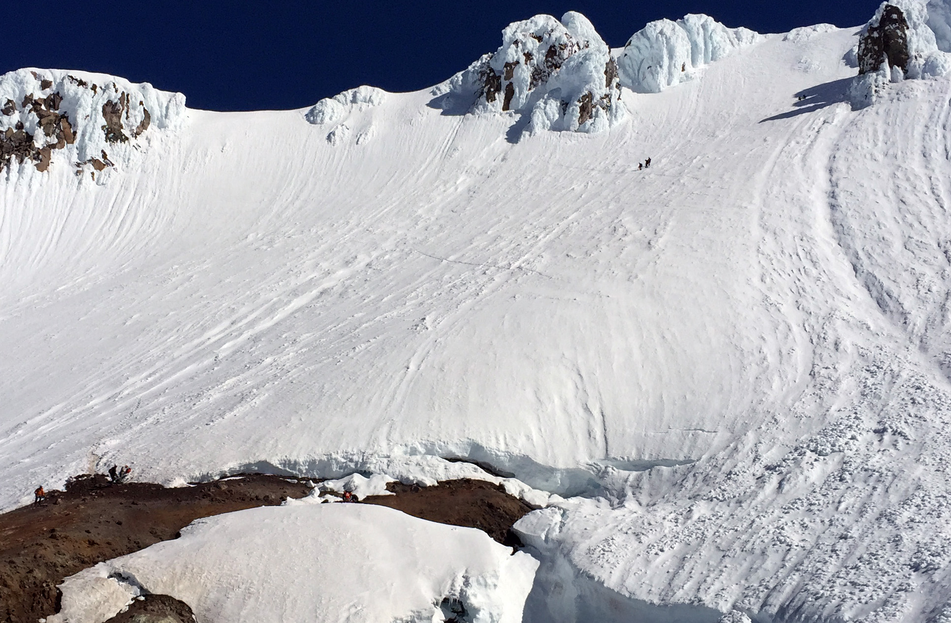 क्रेटर रॉक की चोटी पर पहुँचते ही अगला हिस्सा और भी ज़्यादा ढलान वाला हो गया। यह पहली बार था जब हमें गिरने से बचने के लिए बर्फ की कुल्हाड़ियों का इस्तेमाल करना पड़ा। इस जगह हमने उन्हें कुल्हाड़ी की बजाय बेंत की तरह इस्तेमाल किया। क्रेटर रॉक के पीछे एक हिस्सा है जिसे हॉट रॉक्स के नाम से जाना जाता है, इसलिए यहाँ और ज़्यादा फ्यूमरोल की ज़रूरत थी। गाइडों ने हमें अपने वॉकिंग पोल पीछे छोड़ने को कहा क्योंकि बाकी रास्ता हमें सिर्फ़ अपनी बर्फ की कुल्हाड़ियों पर ही निर्भर रहना था। फिर उन्होंने हमें तीन छोटे समूहों में बाँध दिया। उन्होंने जिस तकनीक का इस्तेमाल किया उसे "शॉर्ट रोपिंग" कहते हैं, यानी पैदल यात्रियों के बीच की दूरी कम, लगभग पाँच फ़ीट। ऐसा इसलिए है क्योंकि अगर कोई गिरता है तो बाकी दो या तीन लोग उसे नीचे गिरने से बचा लेते हैं। लोगों के बीच की दूरी कम से कम रखी जाती है ताकि गिरने वाला व्यक्ति इतनी गति न पकड़ ले कि बाकी सभी को नीचे गिरा दे। ज़्यादा समतल और दरारों से भरी चढ़ाई के लिए "लॉन्ग रोपिंग" का विकल्प ज़्यादा उपयुक्त है।