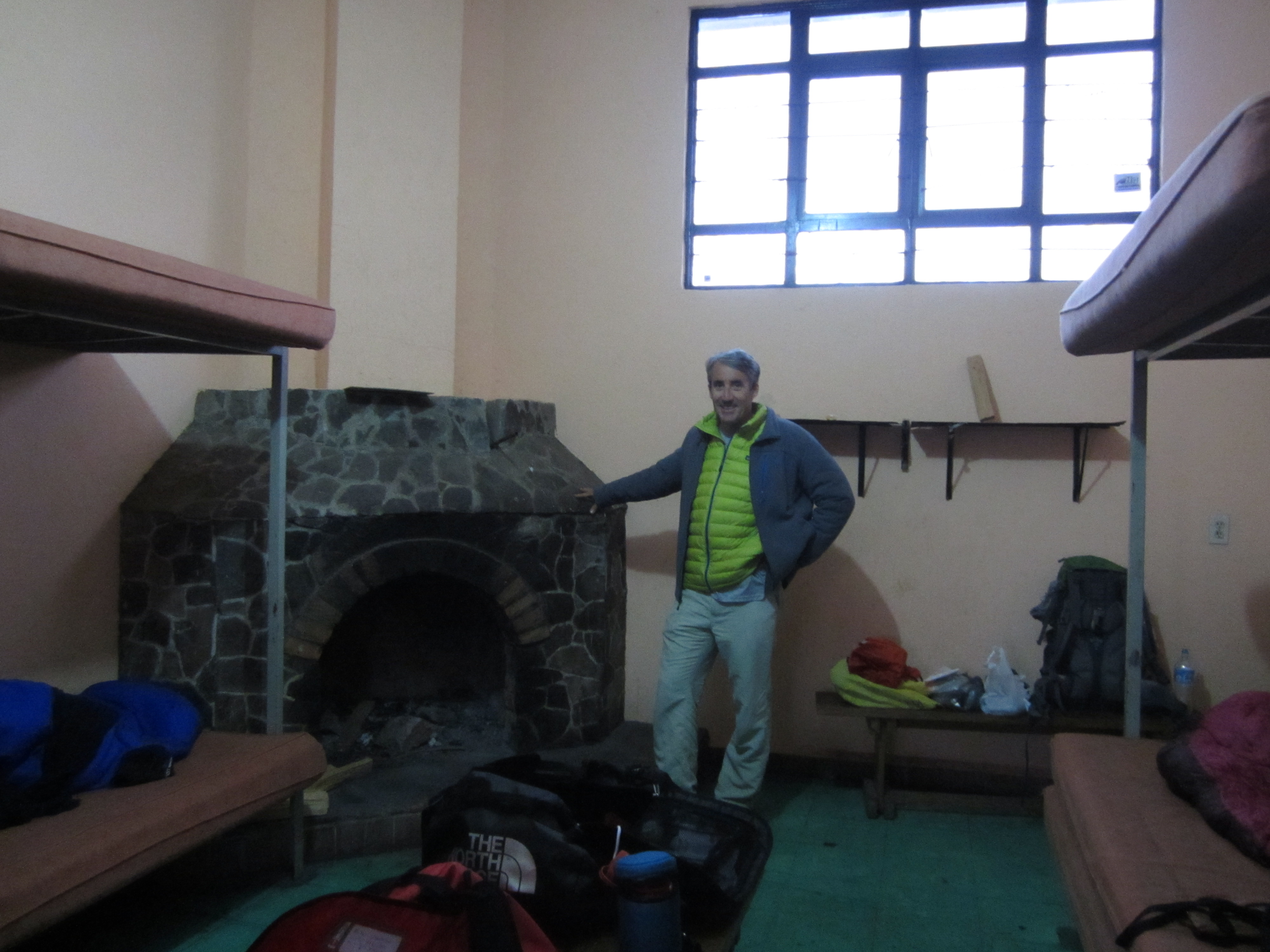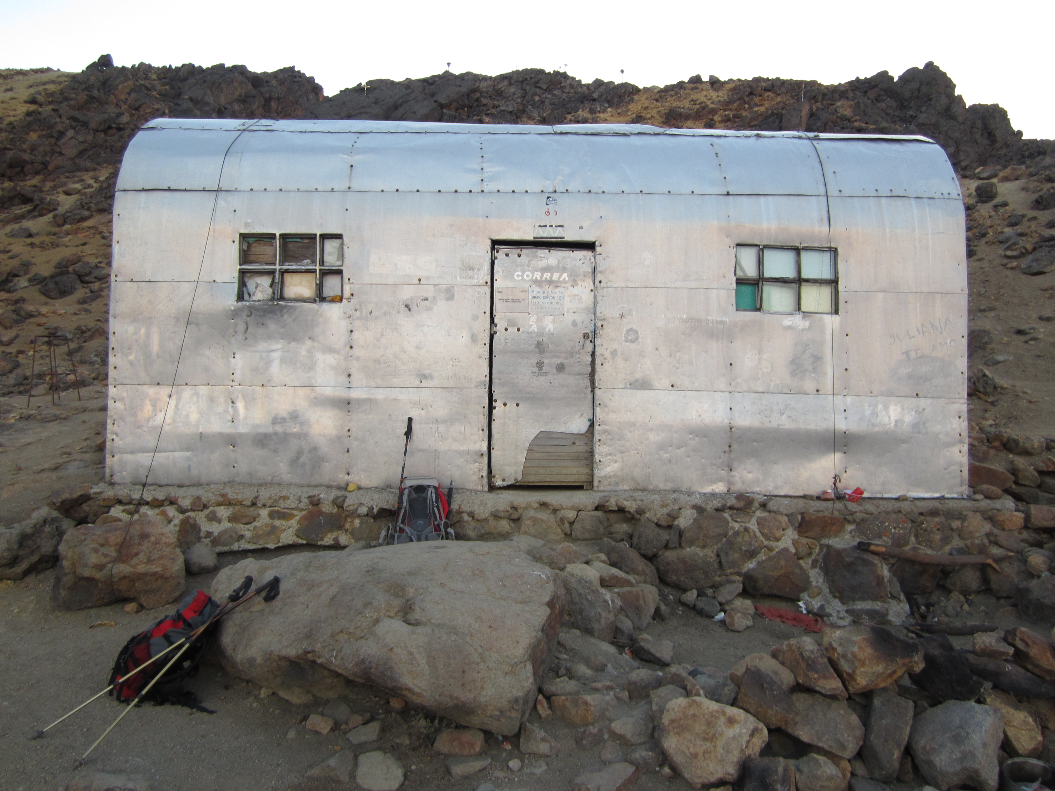 जब हम आखिरकार ठंड और तेज़ हवाओं के बीच लगभग 3:00 बजे रेफ्यूजियो हट पहुँचे, तो हमारी मुलाक़ात तीन और पर्वतारोहियों से हुई जो जाने की तैयारी कर रहे थे। लगभग आधे घंटे बाद वे चले गए और हट अचानक बहुत सुंदर, अँधेरी और शांत हो गई। फिर, अपने कड़े शेड्यूल के बावजूद, हम सब सो गए। किसी ने एक मेक्सिकन कंबल छोड़ दिया था, जिससे मैं गर्म रहता था, और मेरा हेलमेट तकिये की तरह था।
