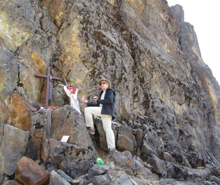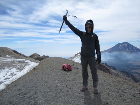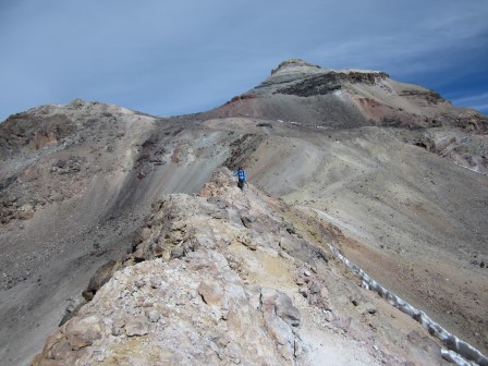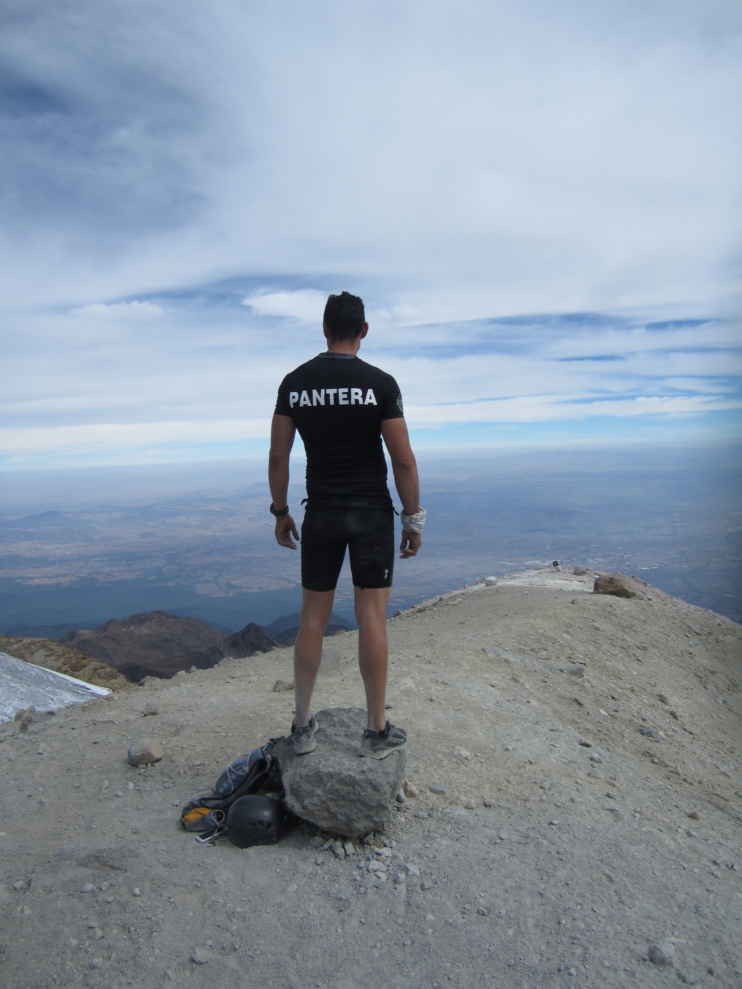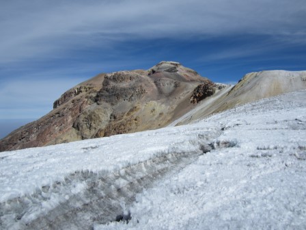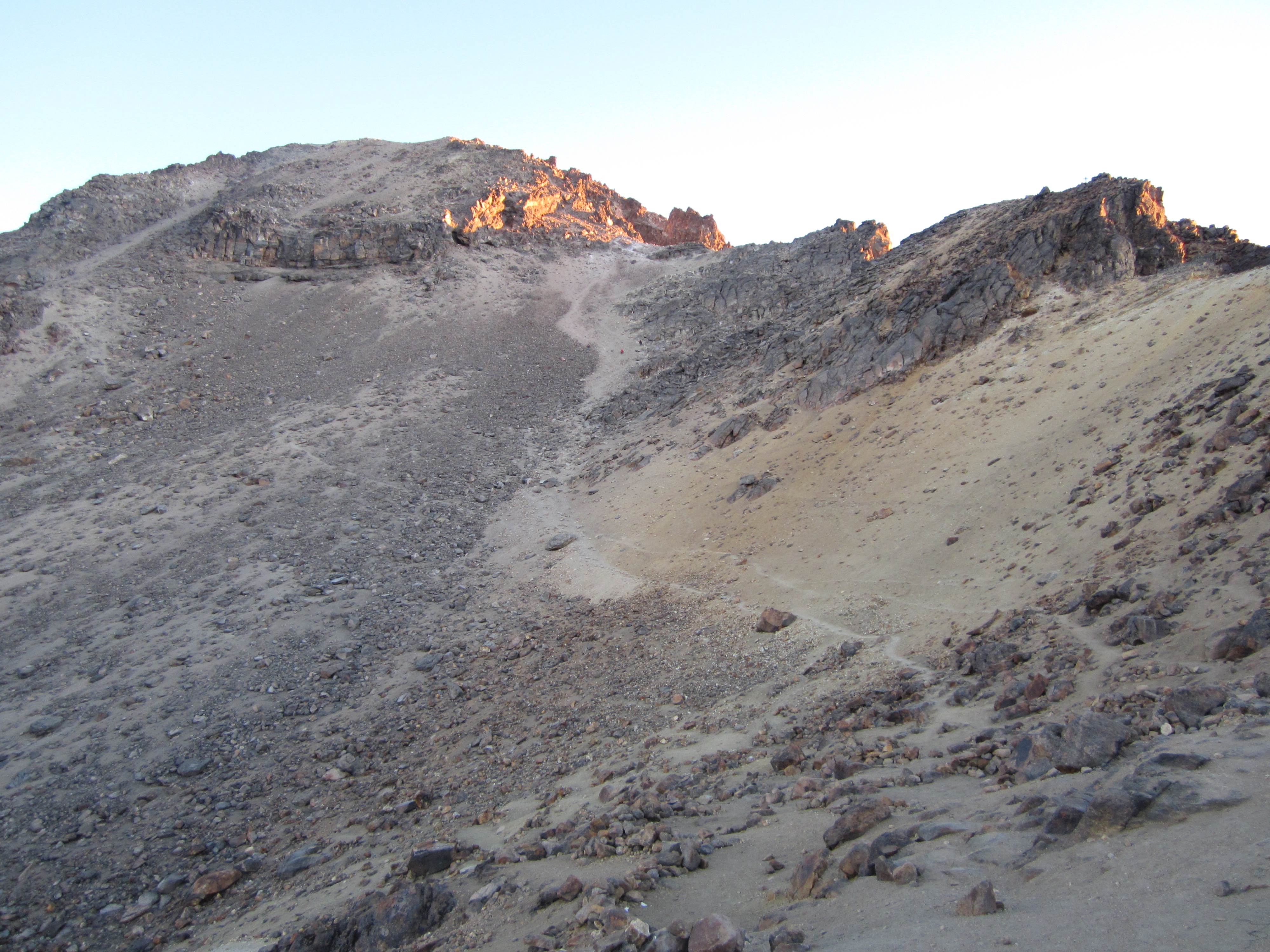 तो, मैंने अपने क्रैम्पन को अपने पैक के नीचे से निकाला और उन्हें अपने जूतों में लगा दिया, ऐसा मैंने माउंट रेनियर के बाद से नहीं किया था और मुझे अब भी याद नहीं रहता कि कौन सा बायाँ है और कौन सा दायाँ। जैसे ही मैं उन्हें पहन रहा था, एक और गाइड अपने एक मेहमान के साथ वहाँ आ गया। वह बहुत जानकार और हट्टा-कट्टा लग रहा था, इसलिए मैंने उससे पूछा कि सबसे ऊपर कौन सा बिंदु है। उसने और उसके मेहमान ने जो सारा सामान पहना हुआ था, उसे देखते हुए मैं उसे पहचान नहीं पाया। पता चला कि वह पाब्लो था, अल्टज़ोमोनी हट का गाइड जिसने हमें एक दिन पहले पानी की कमी से बचाया था।