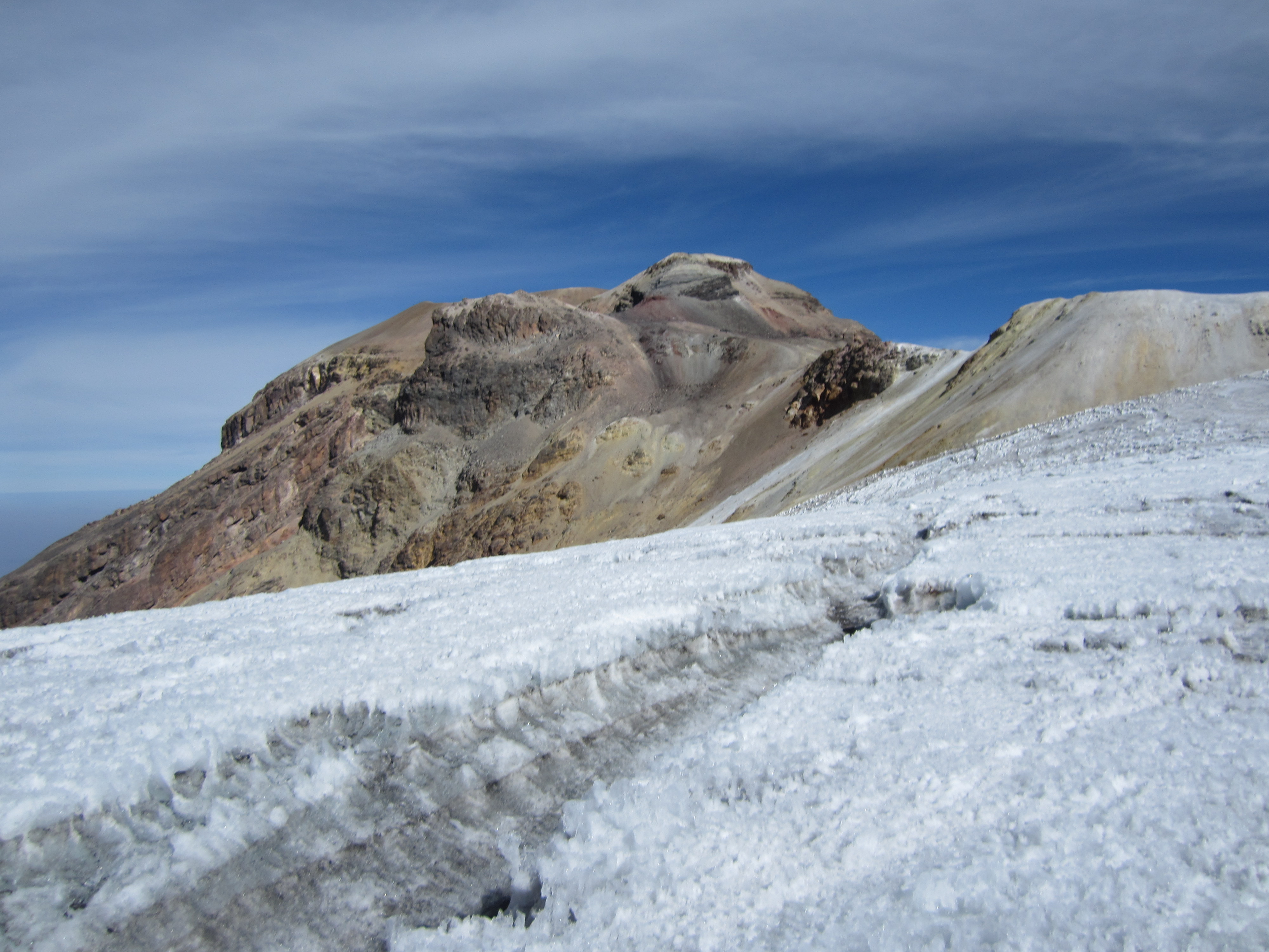 एक तरफ़ से गूँजती सल्फ्यूरिक धुआँ वाली एक चाकू जैसी धारदार पहाड़ी को पार करने के बाद, हम शिखर के पास एक बर्फ़ के मैदान के सामने एक जगह पहुँचे। बर्फ़ के मैदान तक पहुँचने के लिए, किसी को एक खड़ी चट्टान से, या तो ढीली चट्टान पर या बर्फ़ पर, नीचे उतरना पड़ता था। पीछे मुड़कर देखता हूँ तो मुझे अपने क्रैम्पन पहनकर बर्फ़ पर उतरना चाहिए था। मैं सामान ढोता हुआ ऊपर तक गया और अच्छा होता कि उनका कुछ इस्तेमाल कर पाता। हालाँकि, गाइड मुझे बार-बार याद दिला रहा था कि हमारे पास समय कम है, इसलिए मैंने मूर्खतापूर्वक खड़ी और ढीली चट्टानों पर, खुद को रोककर, नीचे उतरने का फैसला किया। मैं अपनी उम्मीद से कहीं ज़्यादा तेज़ी से नीचे उतरा। पता चला कि चट्टान असल में बर्फ़ के ऊपर चट्टान की एक पतली परत थी। खुशकिस्मती से, मैं नीचे उतर गया, मेरे बाएँ पैर में बस मामूली कट लगे।