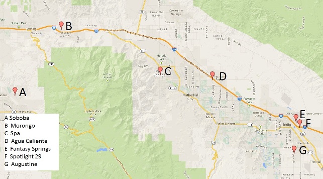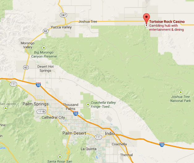 वेगास से पाँच घंटे की ड्राइव और लॉस एंजिल्स से केवल दो घंटे की ड्राइव (अच्छे ट्रैफ़िक के साथ) पर स्थित, कोचेला घाटी के आसपास कैसीनो का एक समूह बिखरा हुआ है, जहाँ पाम स्प्रिंग्स और आस-पास के रेगिस्तानी समुदाय बसे हुए हैं। कुछ देर की देरी के बाद, मैंने आखिरकार पाम स्प्रिंग्स और उसके आसपास के सात कैसीनो में से ज़्यादातर का दौरा करने का फैसला किया। मैं इस ब्लॉग प्रविष्टि को अपनी 2009 की सैन डिएगो यात्रा रिपोर्ट का अनुवर्ती मानता हूँ, क्योंकि यह काफ़ी नज़दीक है। इस पृष्ठ का अधिकांश भाग सितंबर, 2013 की एक यात्रा पर आधारित है। अपवाद यह है कि उस समय टॉर्टोइज़ रॉक कैसीनो खुला नहीं था, जहाँ मैं अक्टूबर, 2014 में गया था।