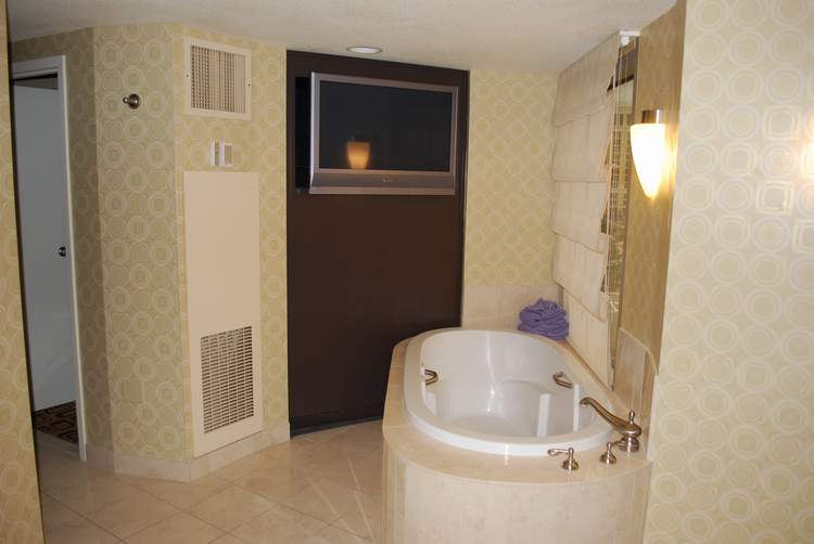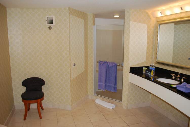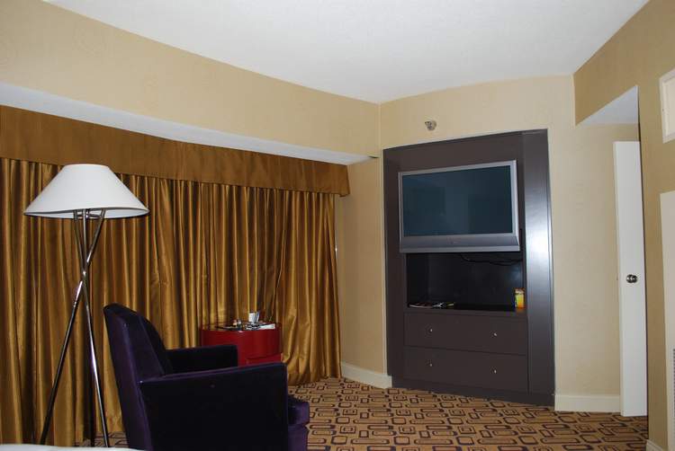 ऊपर वीआईपी चेक-इन ढूँढ़ना थोड़ा मुश्किल था, लेकिन मेहनत रंग लाई। वहाँ बिल्कुल भी इंतज़ार नहीं करना पड़ा, इसलिए मैं झटपट अंदर चला गया। उत्तरी टावर में मेरा अपग्रेडेड कमरा बहुत अच्छा था। उसमें दो बड़े फ्लैट-स्क्रीन टीवी, एक बड़ा बाथरूम, काफ़ी अलमारी, एक बिडेट और बेलाजियो फव्वारों का नज़दीकी, लेकिन आंशिक रूप से अवरुद्ध दृश्य था। बिस्तर तकिये वाला नहीं था, लेकिन फिर भी आरामदायक था और उस पर बहुत मुलायम चादरें बिछी थीं। मेरी एकमात्र शिकायत यह थी कि बिस्तर के बगल में लगा घड़ी वाला रेडियो लगभग हर घंटे में एक बार हल्की कंपन की आवाज़ करता था, जिससे कभी-कभी मेरी नींद खुल जाती थी।
