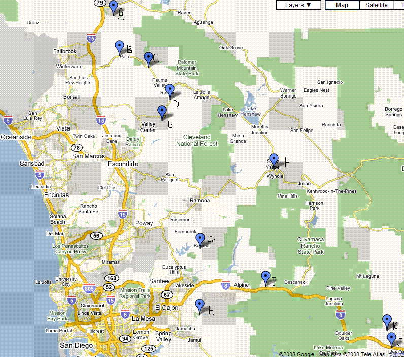 जैसा कि आप मानचित्र में देख सकते हैं, उनमें से पाँच (पेचांगा, पाला, पौमा, हाराह और वैली व्यू) काउंटी के उत्तरी भाग में एक साथ स्थित हैं। दरअसल, पेचांगा काउंटी सीमा के ठीक पार, रिवरसाइड काउंटी में है। उनमें से तीन (विएजास, गोल्डन एकॉर्न और ला पोस्टा) काउंटी के पूर्वी भाग में, I-8 राजमार्ग से दूर हैं। बाकी तीन (बैरोना, सिकुआन और सांता यसाबेल) अलग-अलग हैं, और आसानी से किसी समूह में नहीं आते। आगे उत्तर से दक्षिण की ओर बढ़ते हुए, प्रत्येक कैसीनो के बारे में मेरी टिप्पणियाँ दी गई हैं।