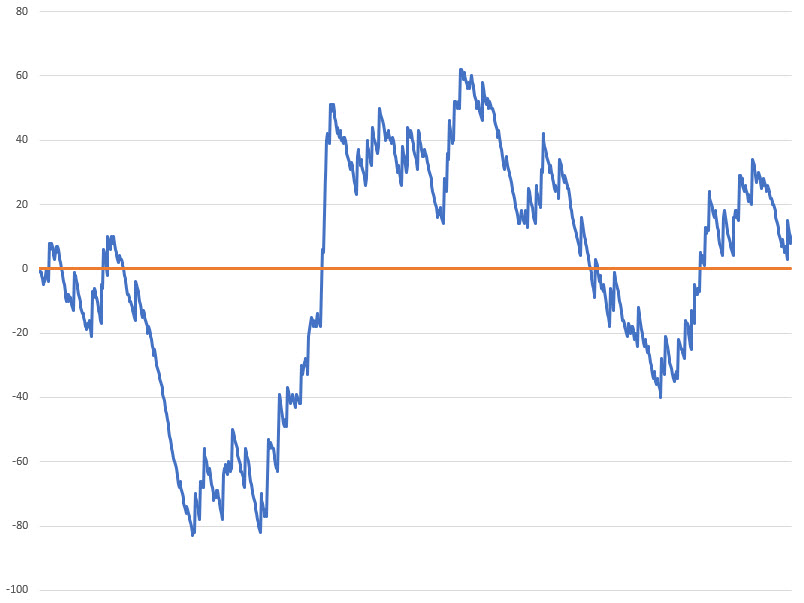 निम्न तालिका एकल-शून्य रूलेट में किसी भी सम-धन दांव पर 1-3-2-6 प्रणाली का पालन करके शुद्ध जीत, संभावना और लाभ में योगदान दर्शाती है। निचला दायाँ कक्ष प्रति सत्र 0.097936 इकाइयों की अपेक्षित हानि दर्शाता है। प्रति सत्र दांवों की औसत संख्या 3.623616 है। प्रति सत्र अपेक्षित धन हानि और दांव पर लगाए गए धन का अनुपात 0.027027 है।