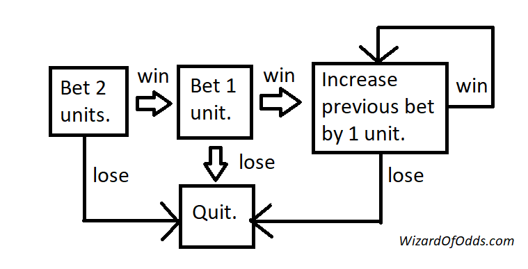 इसे समझाने का एक अन्य तरीका यह है कि खिलाड़ी दो-इकाई दांव से शुरू करता है और जीत के बाद हमेशा एक इकाई से अपना दांव बढ़ाता है, सिवाय इसके कि वह पहली जीत के बाद एक इकाई से अपना दांव कम कर देता है।