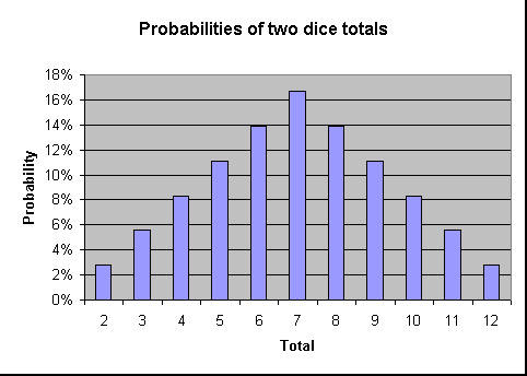 नीचे दिए गए चार्ट में प्रत्येक योग को फेंकने की संभावना दर्शाई गई है। जैसा कि चार्ट में दिखाया गया है, योग 7 के जितना करीब होगा, उसके फेंकने की संभावना उतनी ही अधिक होगी।
