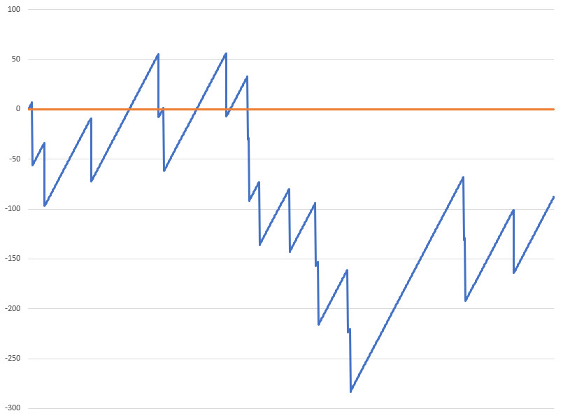 आइए एक ऐसी स्थिति पर विचार करें जहाँ खिलाड़ी लगातार छह बार हारने वाले दांव लगा सकता है। इसके लिए जीत के लक्ष्य से 63 गुना अधिक बैंकरोल की आवश्यकता होगी। एक इकाई के जीत के लक्ष्य को प्राप्त करने की संभावना 98.3051% है। यदि खिलाड़ी बार-बार ऐसा करता है, तो वह 63 इकाइयों के प्रत्येक हारे हुए सत्र के लिए औसतन 58.000094 जीत सत्रों की उम्मीद कर सकता है। ध्यान दें कि 63 इकाइयों का नुकसान हार के बीच 58 जीत से अधिक है। अंत में, यदि खिलाड़ी इसे तब तक दोहराता रहता है जब तक कि वह एक-एक इकाई करके अपने बैंकरोल को दोगुना नहीं कर लेता, या दिवालिया नहीं हो जाता, तो उसके बैंकरोल के दोगुने होने की संभावना 34.0634% है।
