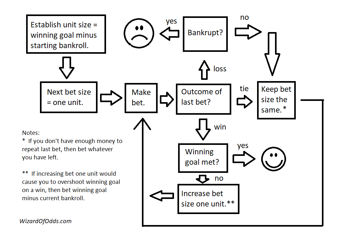 - खिलाड़ी तब तक खेल को दोहराता रहता है जब तक कि वह या तो अपने विजयी लक्ष्य तक नहीं पहुंच जाता या अपना पूरा बैंकरोल खर्च नहीं कर देता।