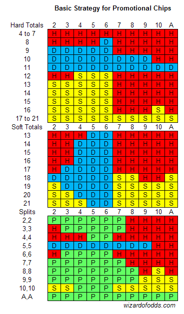 निम्नलिखित बुनियादी रणनीति तालिका ऊपर दिए गए नियमों के तहत, प्रमोशनल चिप्स के लिए है। अगर खिलाड़ी को स्प्लिटिंग के परिणामस्वरूप केवल असली पैसे वाले निर्णय का सामना करना पड़ता है, तो उसे पारंपरिक बुनियादी रणनीति पर वापस लौटना चाहिए। सॉफ्ट 21 के लिए पंक्ति, दहाई के पत्तों को विभाजित करने के बाद 2-कार्ड सॉफ्ट 21 के लिए है, ब्लैकजैक के लिए नहीं।
