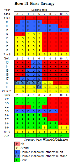 बर्न दांव अपने आप में बेहद नकारात्मक होता है। विशेष रूप से, खिलाड़ी ब्लैकजैक दांव पर किसी भी लाभ पर विचार करने से पहले, उस पर लगाए गए अपने दांव का 67.31% खोने की उम्मीद कर सकता है। यह देखते हुए कि खिलाड़ी को बर्न दांव पर अपने मूल दांव का आधा दांव लगाना होगा, खिलाड़ी को बर्न विकल्प का उपयोग तभी करना चाहिए जब वह अपने ब्लैकजैक दांव के मूल्य में 67.31% * 50% = 33.65% की वृद्धि करने की स्थिति में हो। निम्नलिखित रणनीति विशेष रूप से तब दर्शाती है जब बर्निंग का मूल्य 33.65% से अधिक हो, ऐसी स्थिति में खिलाड़ी को बर्न विकल्प का उपयोग करना चाहिए।