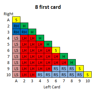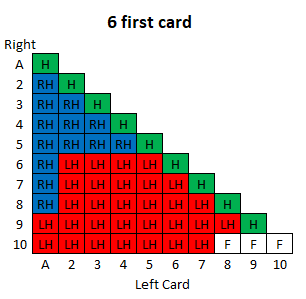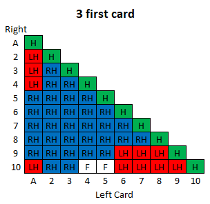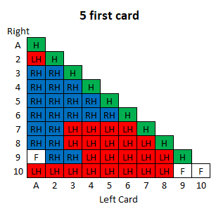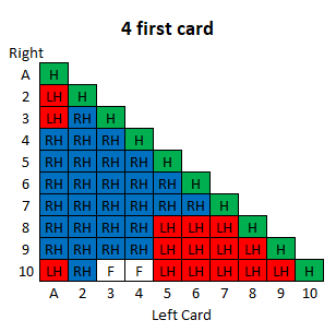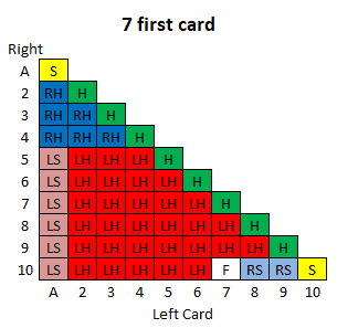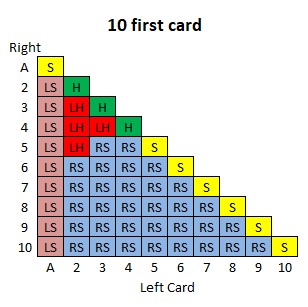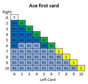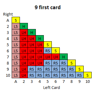 दस रणनीति तालिकाएँ हैं, प्रत्येक प्रारंभिक खिलाड़ी कार्ड के लिए एक। प्रत्येक तालिका का उपयोग करने के लिए, नीचे की पंक्ति में बाएँ कार्ड और बाएँ स्तंभ में दाएँ कार्ड को देखें। दसवीं तालिका के बाद एक कुंजी दी गई है।