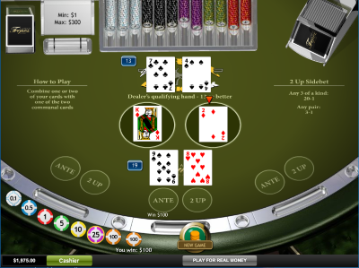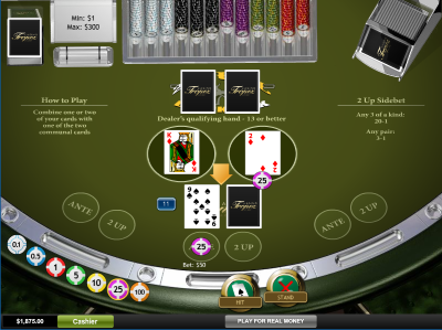 - 2 अप साइड बेट खिलाड़ी के पहले कार्ड और दो कम्युनिटी कार्ड्स के आधार पर भुगतान करता है। यह एक तरह के तीन कार्ड के लिए 20 से 1 और एक जोड़ी कार्ड के लिए 3 से 1 का भुगतान करता है।