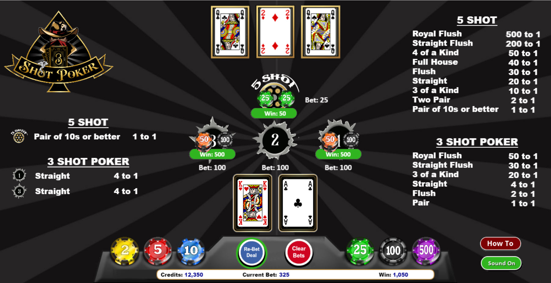 - प्रथम शॉट, द्वितीय शॉट और तृतीय शॉट दांव निम्नलिखित तीन-कार्ड पोकर हाथों के पोकर मूल्य और नीचे दी गई भुगतान तालिका पर आधारित होंगे: