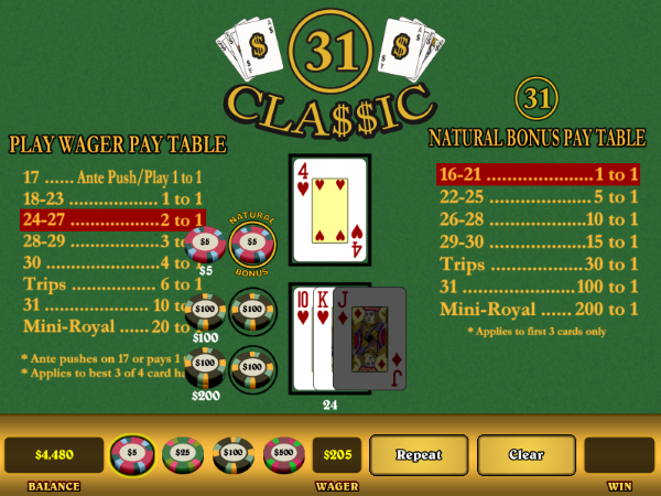 - जैसा कि ऊपर बताया गया है, नेचुरल 31 ड्रॉ बेट का भुगतान खिलाड़ी के मूल तीन कार्डों के मूल्य के आधार पर किया जाएगा। भुगतान तालिका नीचे दी गई है।