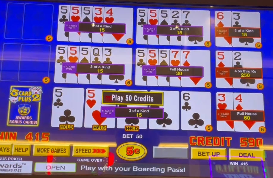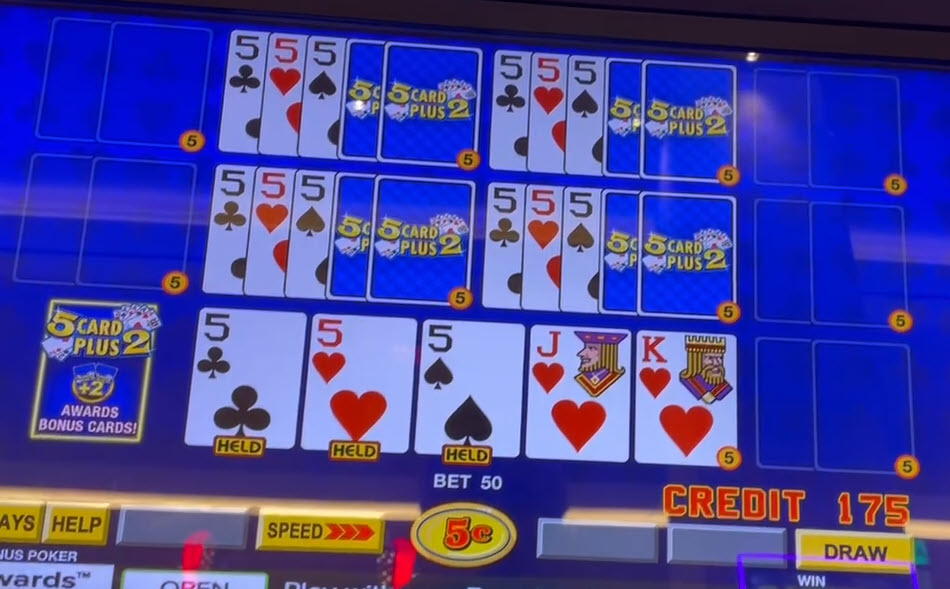 अक्टूबर 2024 में लास वेगास के डुरंगो कैसीनो में मुझे 5 कार्ड प्लस 2 देखने को मिला। कई वीडियो पोकर वेरिएंट की तरह, यह मल्टी-प्ले गेम्स के अलावा एक वैकल्पिक सुविधा है। खिलाड़ी को अपने हाथ में दो अतिरिक्त कार्ड जोड़ने का मौका पाने के लिए अपनी बाजी दोगुनी करनी होगी।