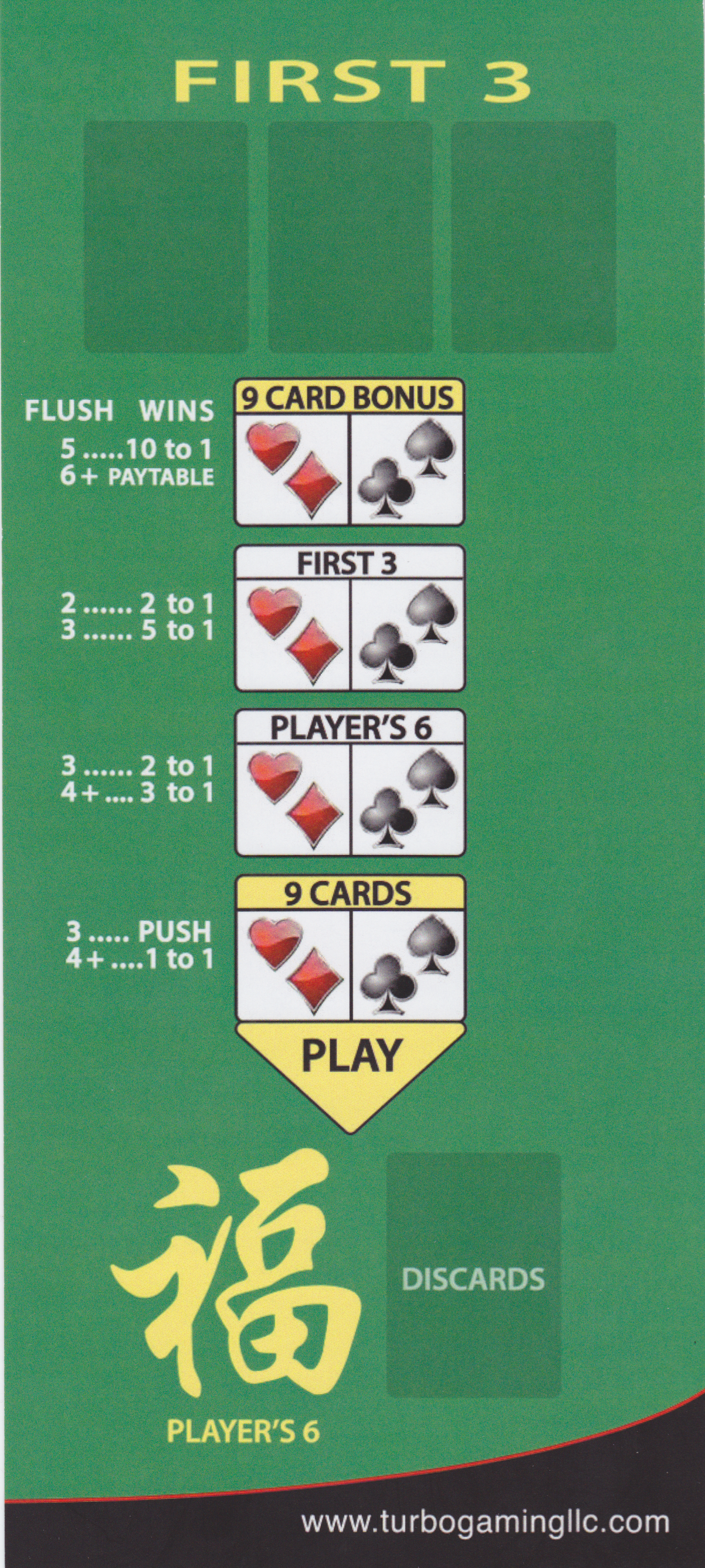 निम्नलिखित खिलाड़ी के 6 दांव के लिए भुगतान तालिका है, जो प्रारंभिक तीन के बाद बांटे गए छह कार्डों पर आधारित है।